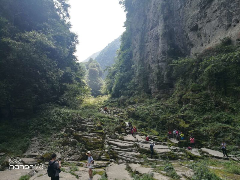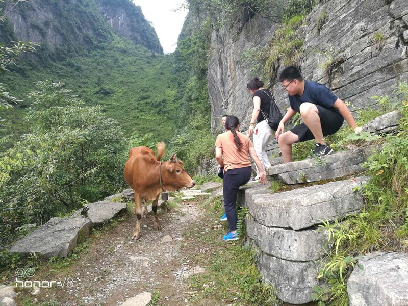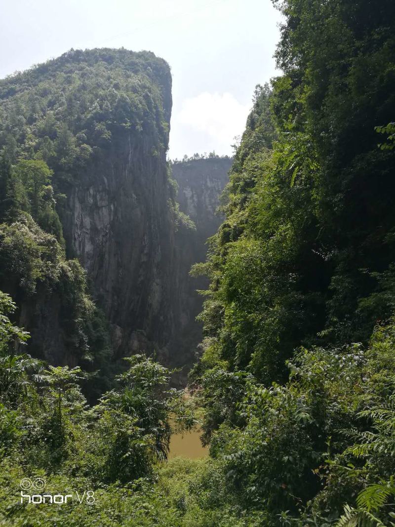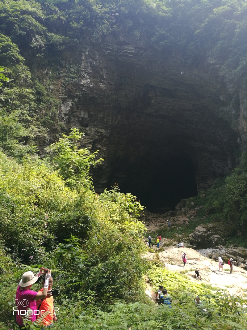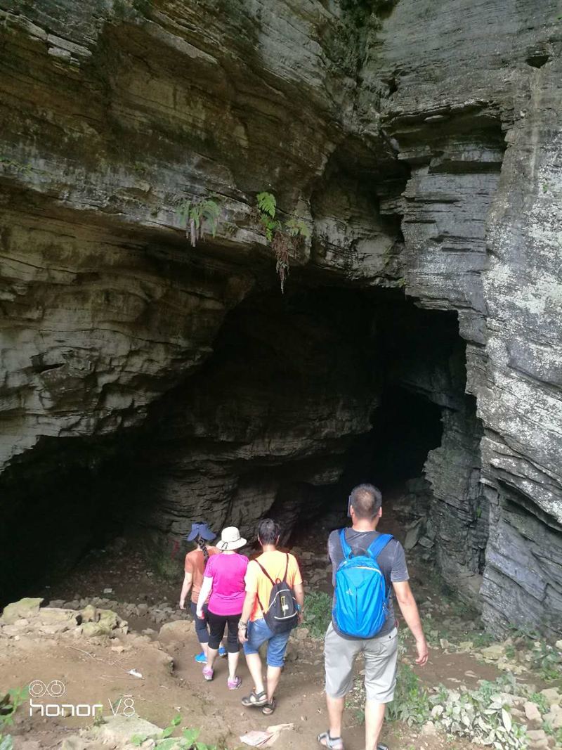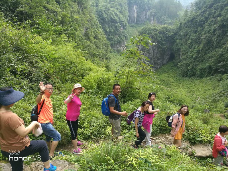 游清江古河床篇 22日清晨六点,从宾馆出发去游玩最后一个景点~清江古河床。经过一个多小时的车程,徒步20多分钟,来到了古河床峡谷的一个入口。有趣的是入口处拴着一头小黄牛,像收费员一样拦着了我们前进的道路,让我们的美女们忘了淑女风范,翻山坡躲避绕道而行。 站在峡谷的垭口远远眺望,好大一片草坪,像绿色的绒毯铺在峡谷,好汉坡与周围连绵起伏的山连成一片,满眼都是那茵茵的绿意,说不出的畅快和欢愉。 从好汉坡向下虽又高又陡又长,弯弯曲曲的的小路如鸡肠子一样绵延不绝,先下去的人身影越来越远,越变越小。道路虽然光滑难行,大家在谢大忽悠的鼓励下、相互帮扶下和、看花人的哨声和大家的欢歌笑语中来到了谷底的绿茵草坪上开始了臭美拍照、撒欢嬉闹。 古河床方圆十里无人烟,风光十分秀美。这里百里绝壁、瀑布飞溅、独峰傲啸、森林原始、村寨古朴。更有一线天、熊猫洞、大小龙门、独家寨、洞群、暗河、地缝、独峰、象鼻山、古河床等景色美不胜收。洞中有洞、洞洞相连、洞中有山、山中有洞、伏流密布、石缝众多,钟乳石林立。 这里既有浪漫的爱情故事,又有神秘的洞穴可探寻,还有悠长的古河床可穿越。 时间在穿越龙洞、行走幽谷、徜徉泉水、仰赏绝壁、遥观飞瀑、醉迷绿荫中悄悄流逝。大家兴致勃勃、游兴悅浓,忘却了登山的疲惫,转眼间已是午时了,由于下午还要返程,大家在老二的督促下,依依不舍地从清江古河床峡谷出来。但干枯的河床、裸露的岩石、像梳子梳理过的植被、耸立的岩壁、层层叠叠的石纹、黑黝黝的山洞等给我们就下了难以忘怀记忆。 在独家寨休息片刻,本想进入世外桃源~爱情谷,去寻觅传说中浪漫爱情的足迹,无奈时间有限,未能前往,就下了淡淡的遗憾。 钻过幽静的溶洞,穿过狭窄的玉米地,顶着炎炎的烈日,来到当地土家族饭庄吃午餐,真的好丰富,有自家腊肉、农家鸡蛋、党参炖土鸡、糖拌西红柿、糖拌笨黄瓜、清炒山野菜、蒸南瓜等,我们一共16人,两大桌饭菜,大家吃的很开心。 饭后坐上着疯狂的过山车,伴着刺激欢愉的尖叫,从送行的小巴车上下来换上我们的大巴车,踏上了返程的路途, 短短的四天行程,给我们留下来难以忘怀的记忆。一行十六人像一个大家庭,在谢大忽悠的率领下,驰高速,穿隧洞,行山路,千里迢迢;嬉泉水,乘皮筏,坐浮船,其乐无穷;攀峭山,游栈道,登陡梯,气喘吁吁,探地缝,越峡谷,赏美景,流连忘返;吃山味,品美酒,听雷声,雨中即情。 时间总是短暂,美景留恋难舍;欢乐永镌脑海,期待下次畅游。