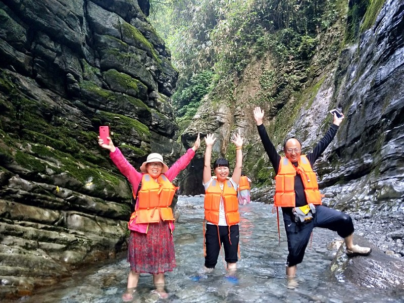 去躲避峡需要小交通转才能到达,山路曲折、盘旋而上,路途错车,都是很小心的,道路狭窄,几次都需要一方车辆找地方让路。景区中下游精华段在开发,禁止游客进入,上游比较危险、开发成本太高,没有开发。个体、农家自行开发,容易发生纠纷。当地政府派出人员、检查车辆,告知危险义务。途中,到一农家取救生衣。至此才明白,这里都是个体自己开发的项目,看救生衣的名字,才能乘船转运,领队一再交代要记住名字救生衣名字。去峡谷的路、碎石掺杂,湿滑,晴天不是太难走,雨天可是泥泞难行,摔跤是不可难免的。豁然中开,堤坝拦路,旁友简易木梯可爬。爬上以后,惊喜立现,一潭碧绿之水拦着去路。橡皮划子、两头尖尖之木船,漂浮在水面静等游客乘坐。此时救生衣上的名字就起上作用了,按照名字,各自转运自己的客人。峡谷窄的地方,两只皮划艇都需蹭着才能过,有的时候船工下水推,还有的地方游人要下水。看到这样好的水、这样好的景致、这么热的天,不下水的是傻子。土司寨子的防御,峡谷两岸皆绝壁,溪潭幽蓝见底,游人划船行上面,飘浮尤如悬地就这样,玩着、嬉闹着,欢呼着、拍照、尽情的飘洒。碧绿湛蓝可深浅;游龙戏凤真好玩。躲避峡内嗨反天;衣服没有一片干。