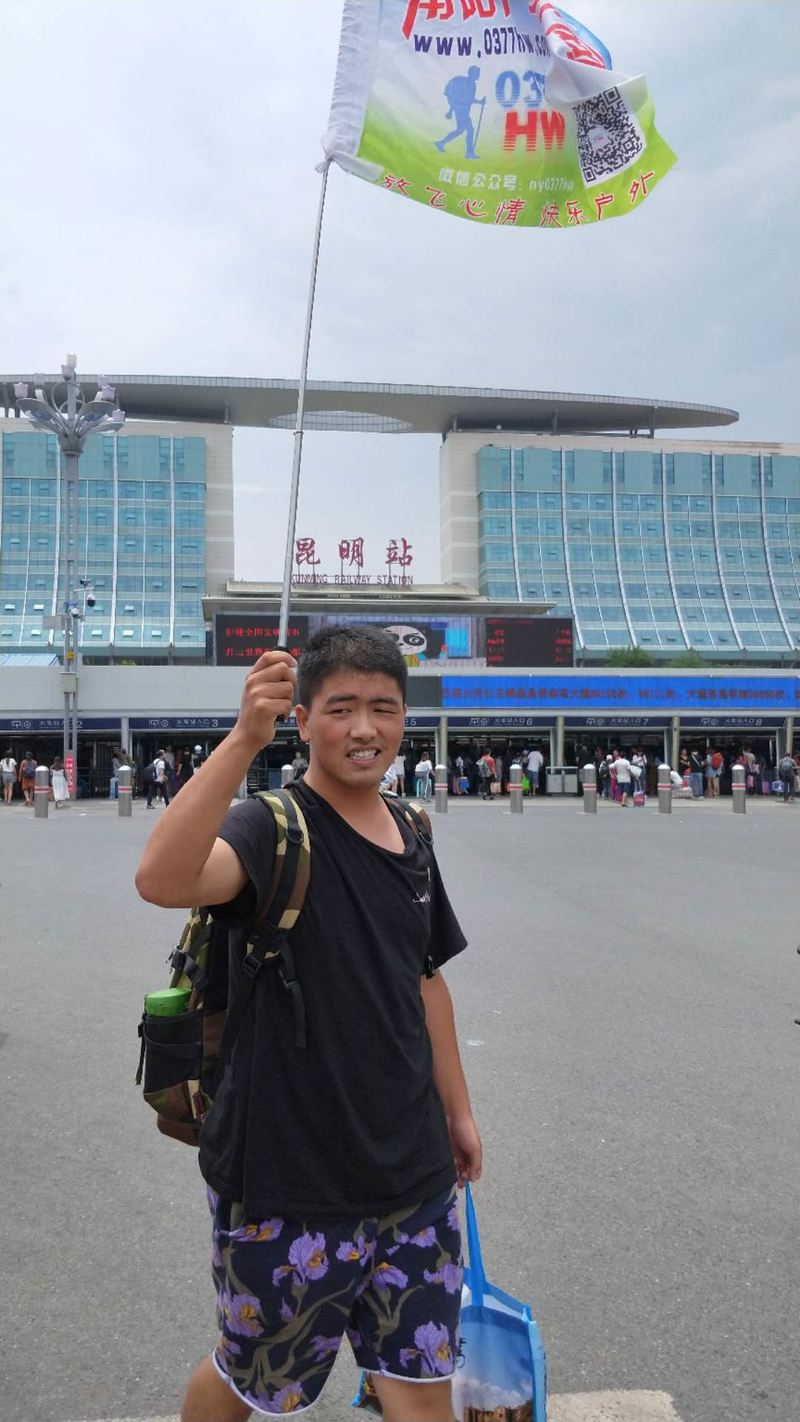 行程前一天:一大早来到火车站,候车厅里刚拿出户外网的旗子,我们云南团队一起坐火车去昆明集合的队友们就围过来了……大家一见如故,在候车大厅里亲密合影留念。
