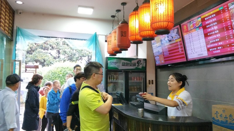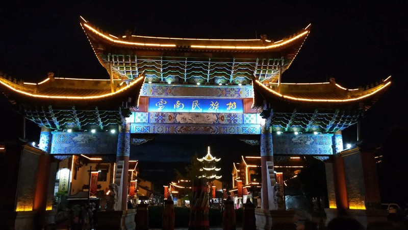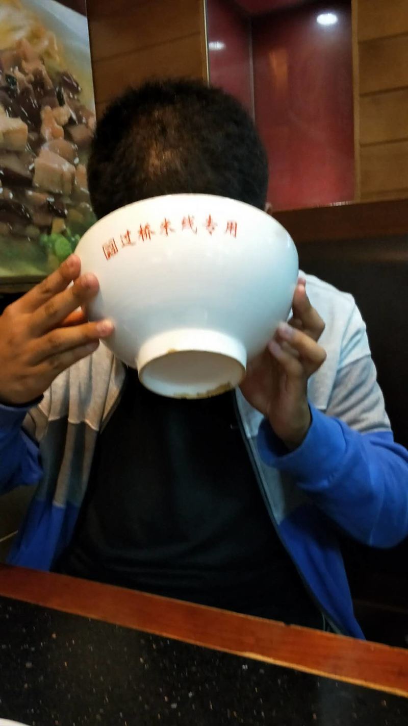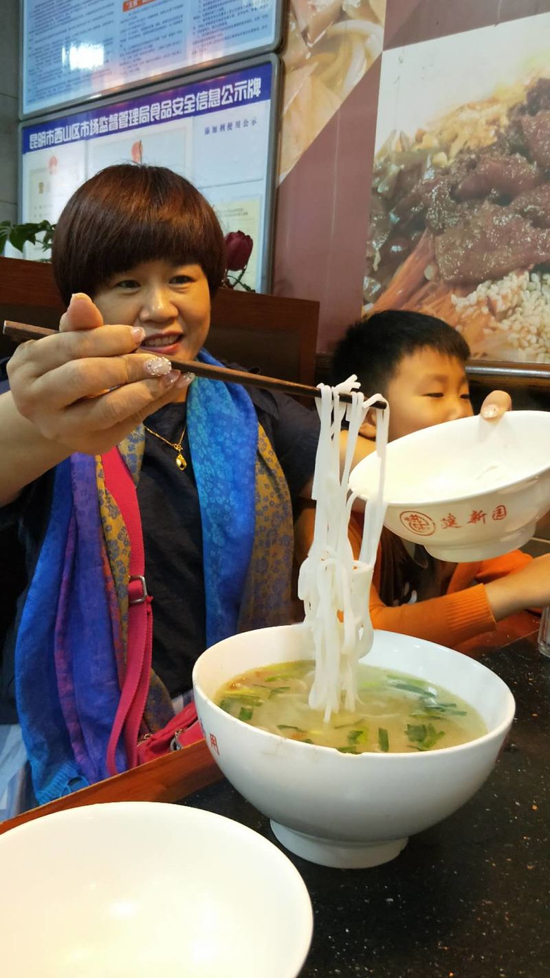 在酒店稍事休息,我们一行几人在酒店附近坐上44路公交车直奔传说中的金马碧鸡坊。金马碧鸡坊就在昆明市中心三市街与金碧路汇处,高12米,宽18米,雕梁画栋精美绝伦,东坊临金马山而名为金马坊,西坊靠碧鸡山而名为碧鸡坊,是昆明的象征。金马碧鸡坊始建于明朝宣德年间,至今已有近四百年的历史。 当太阳将落,余辉从西边照射碧鸡坊,它的倒影投到东面街上;同时,月亮则刚从东方升起,银色的光芒照射金马坊,将它的倒影投到西边街面上;两个牌坊的影子,渐移渐近,最后互相交接。这就是60年才会出现一次的"金碧交辉"的奇观。相传,清道光年间,这个奇观曾经出现过一次。由于地球、月亮、太阳运转的角度关系,这样的景,要 60年才能出现一次。"金马碧鸡坊"的设计体现了古代云南人对数学、天文学和建筑学方面的造诣。 我们虽然不能欣赏到那种“金碧辉煌”的唯美景象,但已然被两座牌坊精美绝伦的雕刻工艺折服。对面是步行街,爱逛街的我当然不能错过了,忍不住又溜跶了一圈。 从步行街出来,天已将暮,儿子们也都嚷嚷着饿了。走,建新园米线来一碗!建新园米线店距离碧鸡牌坊20步之遥。店内干净整洁人满为患,一个个食客挤着排队买单。你问他家米线味道究竟如何?看看我们这个小伙子的吃相你就知道了~~~