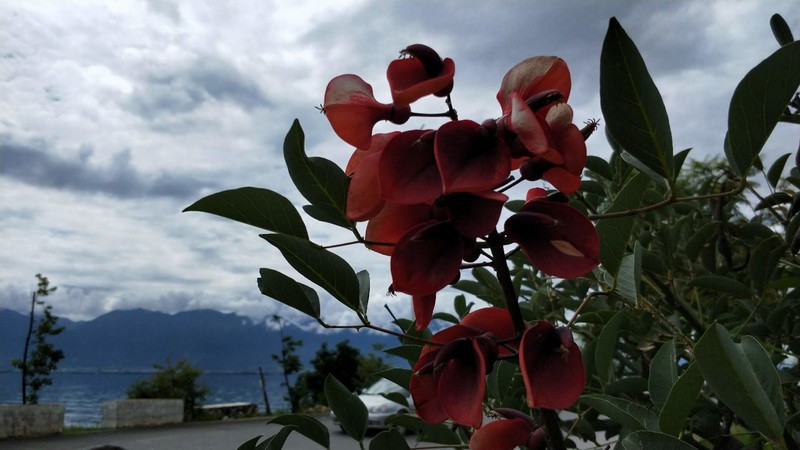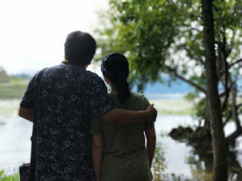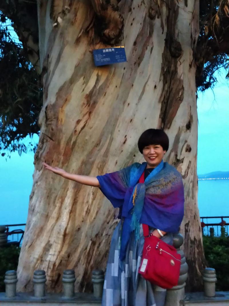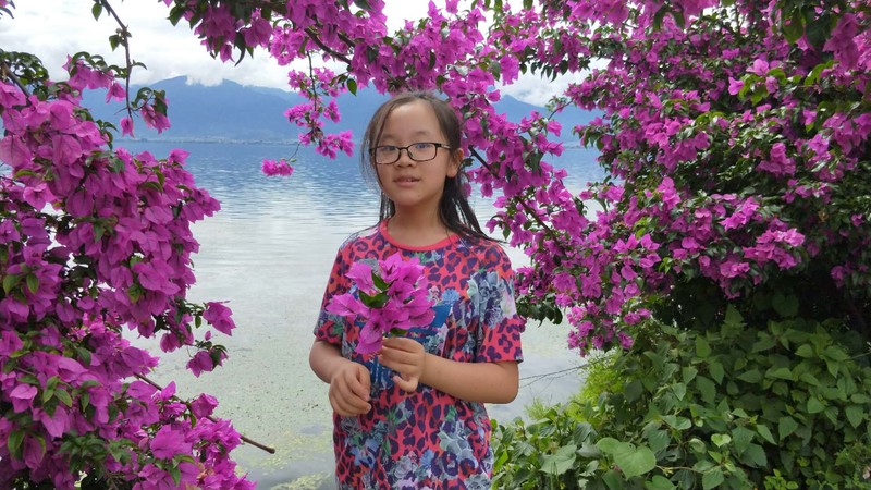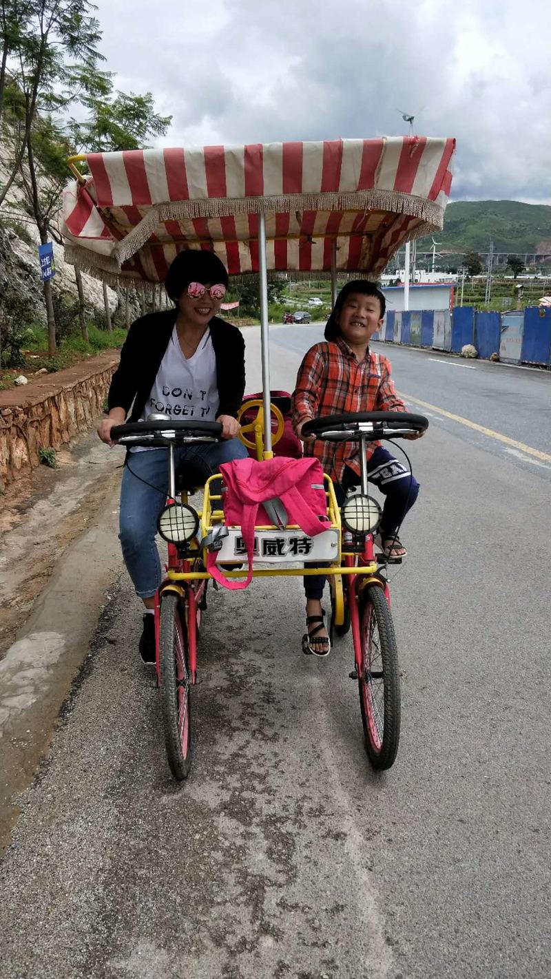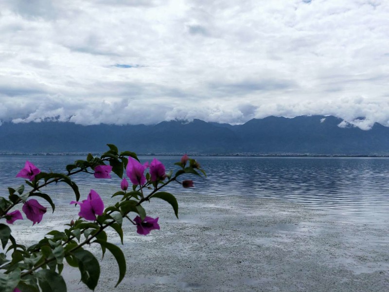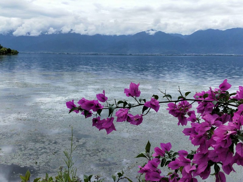 出行第二天:洱海不是海,它是梦的湖。今天网站给大家安排了双廊洱海骑行,队友们有的选择了骑电车,有的选择骑自行车,我和同行的闺蜜以及她的小儿子选择了一辆三人自行车,我俩坐旁边,孩子坐中间,歪歪扭扭就上了路。前行不远刚一左转,洱海就豁然展现在眼前……果断停车,面朝洱海,闻着阳光下那暖暖的味道,迎着湖面吹来的微风,静静地听着湖水拍打岸边的声音,仿佛时光都成了美酒。 围着湖边公路前行,三角梅开满枝桠,美艳无比。在这里拍摄婚纱照的俊男靓女比比皆是,洱海装饰了他们的爱情,他们也装饰了洱海的风景。在湖边的树林里,我们的队友这对夫妻留下了他们深情相拥的背影。