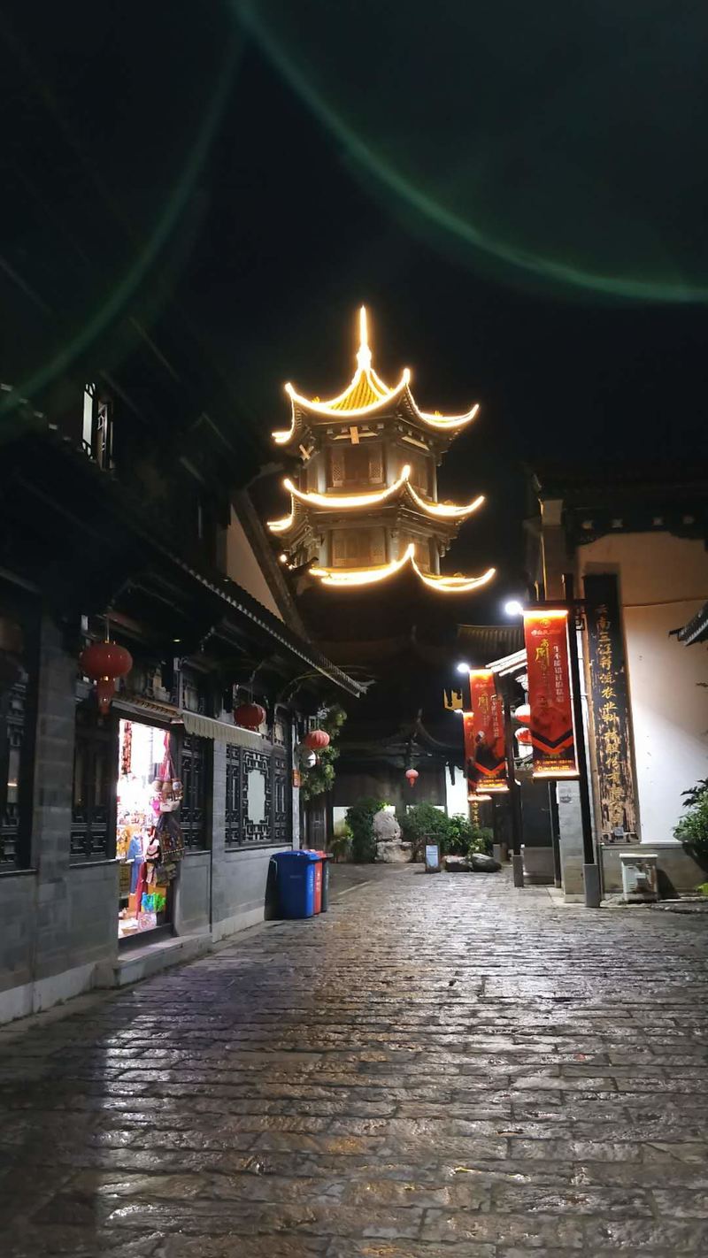 从建新园出来,意犹未尽的我们又坐上回程的44路来到海埂公园。这里环境天然,空气新鲜,南面连接碧波浩瀚的滇池,有2.5公里长的海岸线;西面是连接海埂公园至西山龙门的索道,仅一水相隔,遥呼相应;东面紧邻高尔夫球场和国家体育训练基地;画阁、石舫、观海长廊、葱绿的草坪、海滨休闲广场,据说冬春还会飞来的千万只红嘴海鸥,自然环境别提多么和谐与浪漫。 与海埂公园毗邻的云南民族村夜景辉煌,吸引我们一路散步过去。进了门长长的街道两旁遍布琳瑯满目的特色小店,刚刚下过一阵雨,青石板铺就的路面在路灯的映照下泛着温馨的光芒,此刻,我不想再进村观看民族舞蹈,我只想沿着这条青石小路,追忆青春的时光。