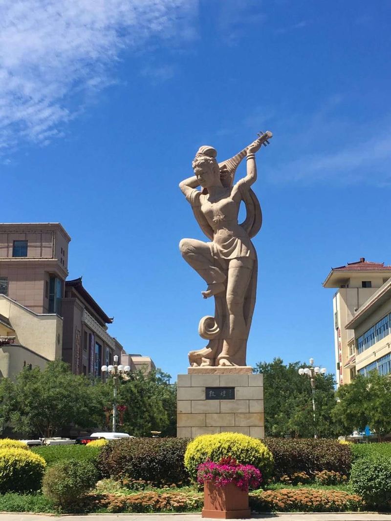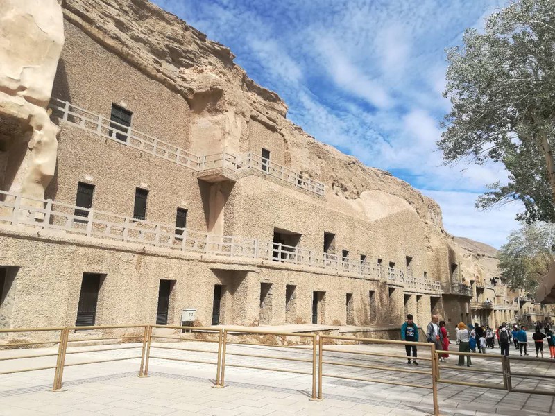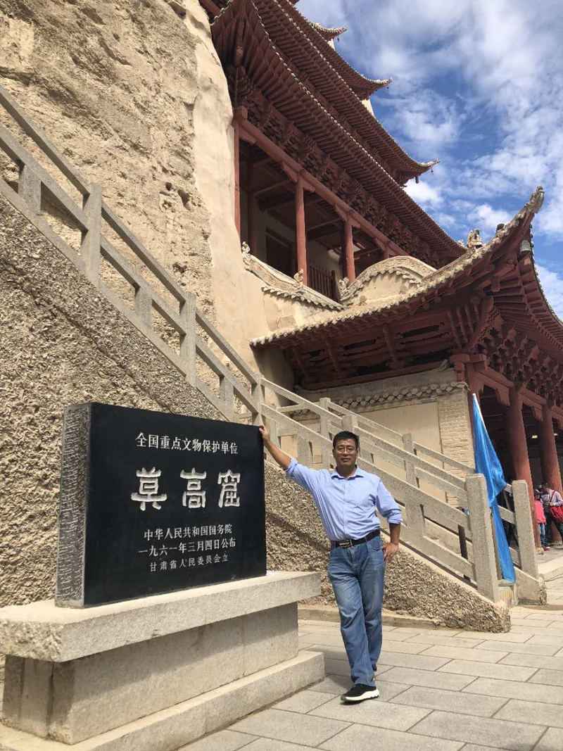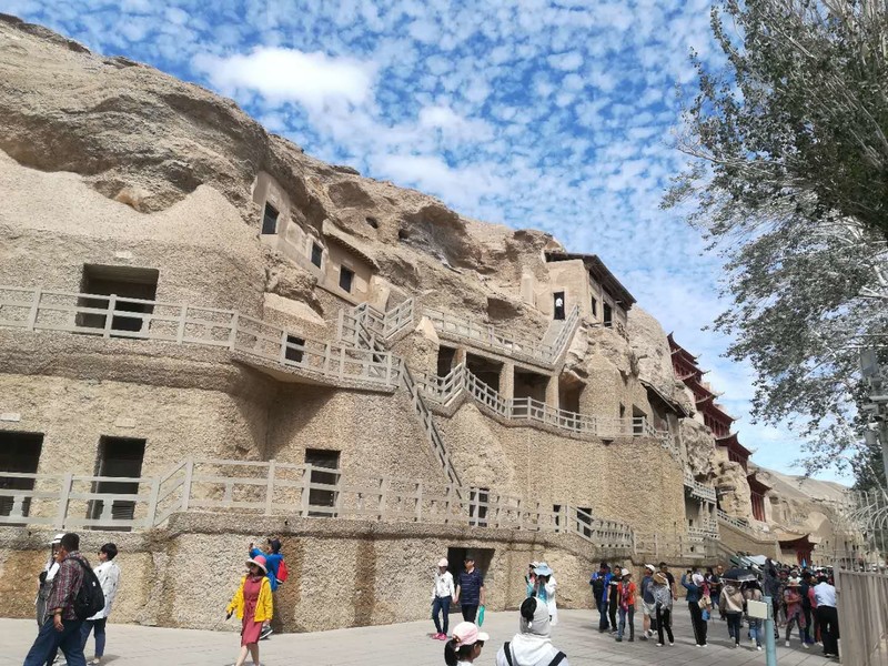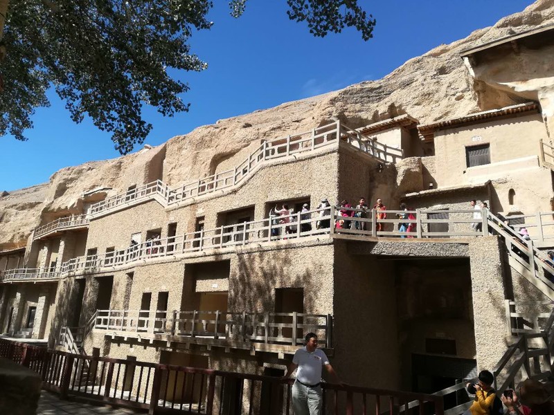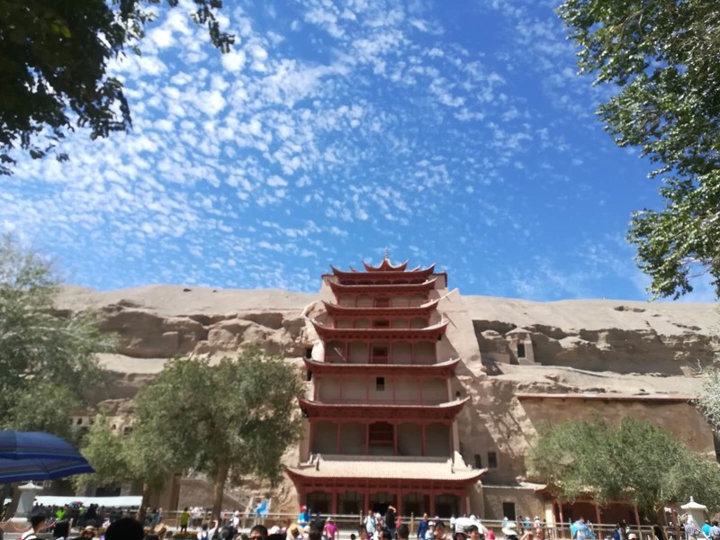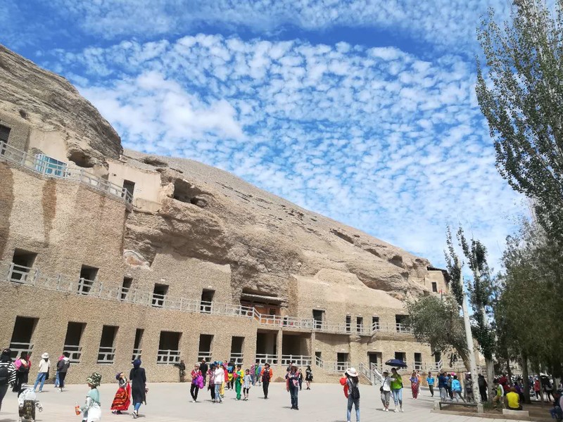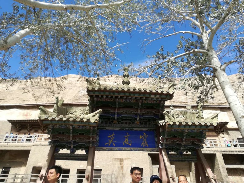 雕刻与绘画的艺术殿堂一一莫高窟:8月16日上午,我们来到了被誉为“沙漠中的美术馆”和“墙壁上的博物馆”的敦煌莫高窟。初入莫高窟,便被其宏大的规模,生动的雕刻,精美的壁画所震撼。和洛阳石窟相比,它的雕像更显完整,无论是坐佛、立佛还是卧佛,都是那么生动逼真,栩栩如生。满墙的壁画,或介绍人物、或讲述故事,每一副生动的画面都能带我们走进历史,跨越千年,去品味中华文化的苍桑与厚重。昨晚的“又见敦煌”已将静态的壁画演绎成生动的现实。震撼的表演加上眼前的所见,更让人体会到了中华民族历史的悠久、文化的灿烂。斑驳的壁画告诉我们,中华民族的遗产是多么弥足珍贵,华夏人类的文明需要我们用生命来捍卫,用激情来传承。因为购买的是应急票,有许多洞窟没有机会进入,但有幸涉足的几个洞窟,已足以使我的内心震颤,它天愧是沙漠中的瑰宝,华夏儿女的骄傲,一千年,一瞬间,历史不该被风沙掩埋,让我们共同珍惜这今天的拥有吧!