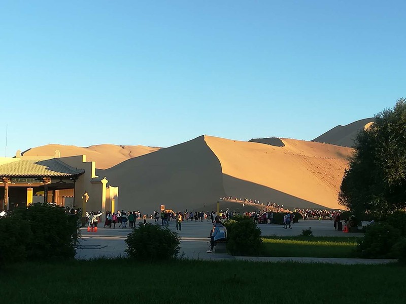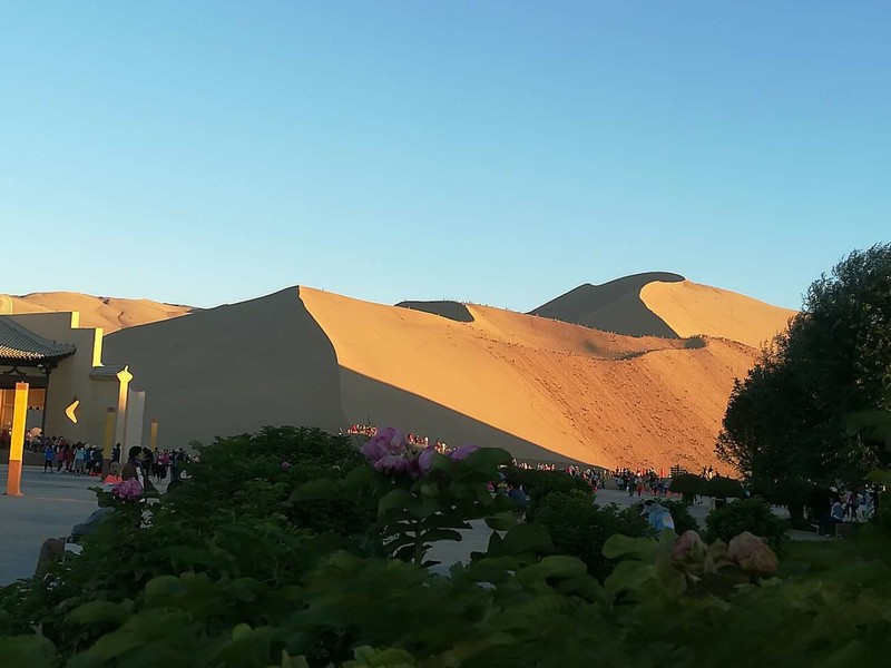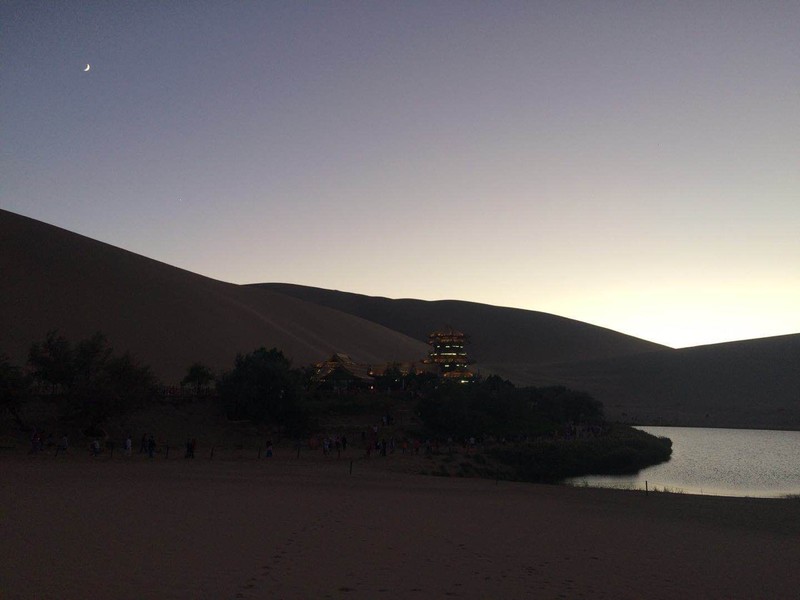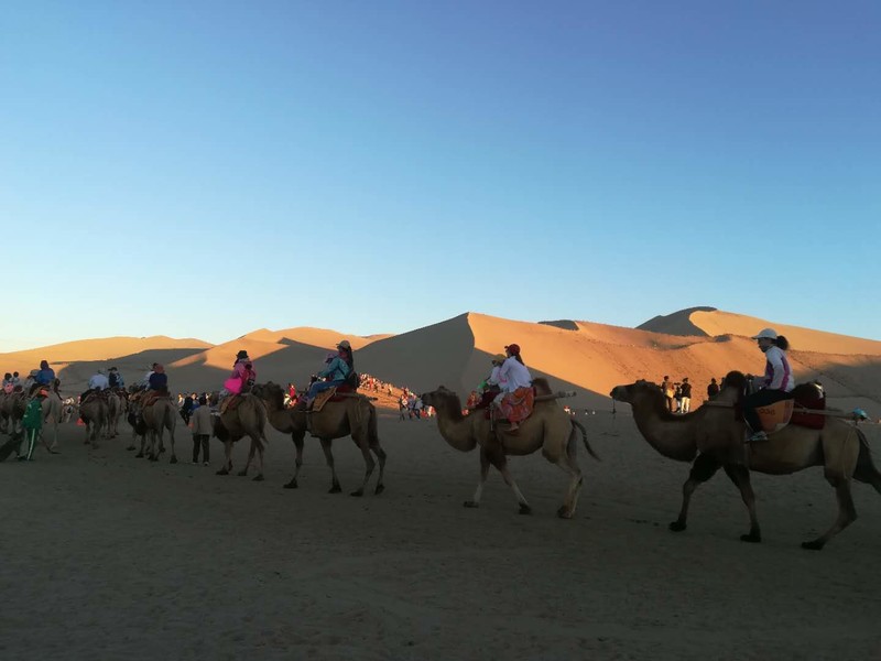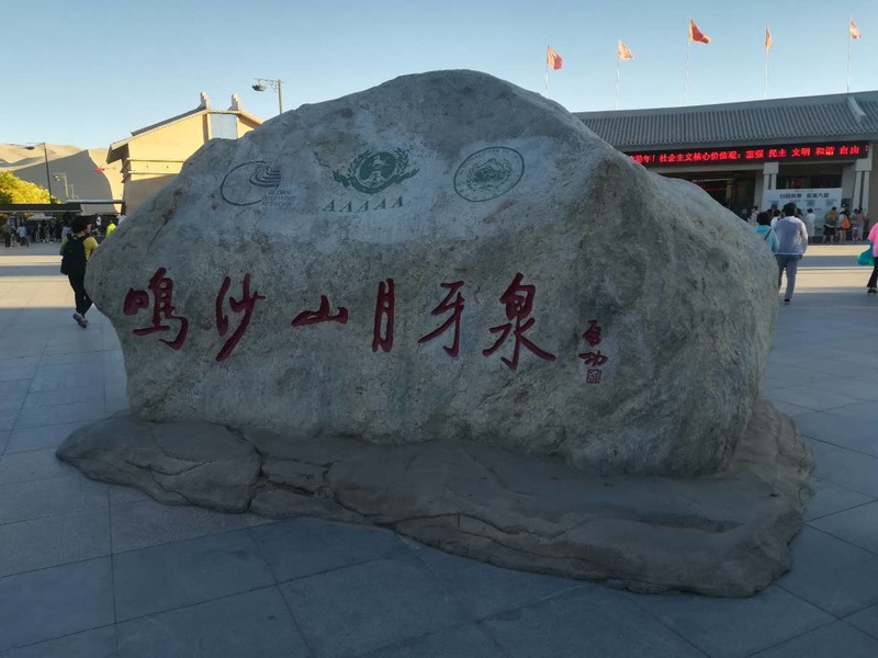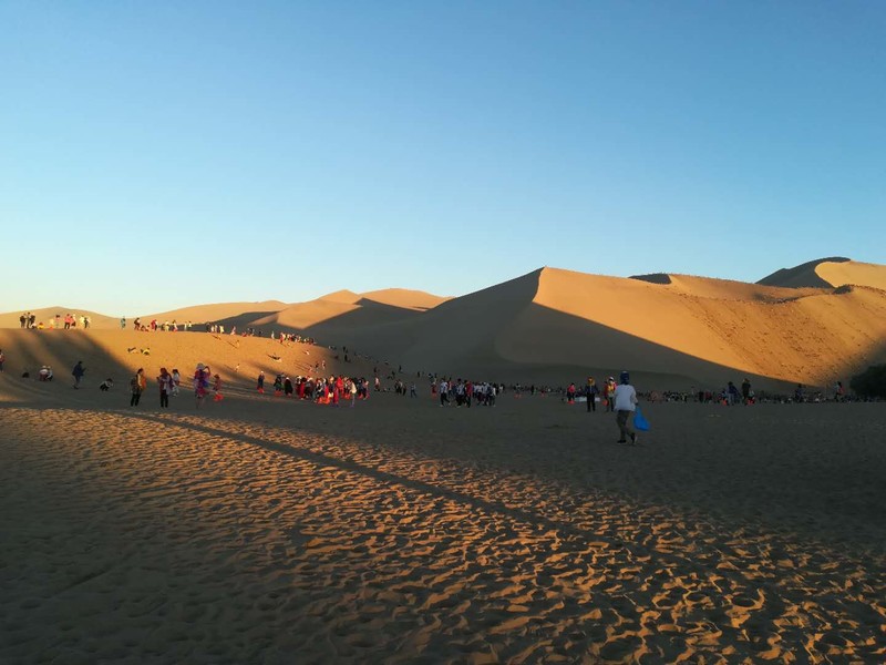 沙漠中的奇迹一一鸣沙山月牙泉。上学时便从书中知道了这个神奇的地方,那个白天黄沙下落,晚上自己往上堆积的沙丘,还有个永远不会被黄沙掩埋的月牙泉。一直以来,我都对这里充满了好奇,更多是憧憬和向往。如今,走在柔柔的沙滩上,用心去感受着这片奇妙的土地。特殊的地理地貌,一点点印正着自己的猜测,于是开始惊叹大自然的鬼斧神工。而此时,它形成的真相到底是什么已并不重要。脱掉鞋子,让脚和大自然来一个亲密的接触,抑或爬上沙丘的顶端,任由身体自由地向下滚落,把烦恼扔在山顶,让疲惫融入那柔软的沙子,此刻留下只有快乐、欢笑和尽情的呐喊。如果你愿意,可骑上一匹骆驼,在沙漠中缓行,任由悠扬骆铃声在耳边轻响。你也可掬起一捧清泉,看那清凉在指间滑落。等到日薄西山,你还可躺在沙滩上,看那如钩的明月,仰望满天的星斗,此刻你会发现,人的心境竟然会如此的坦然,鸣沙山月牙泉,又是一个让人留连忘返的好所在。