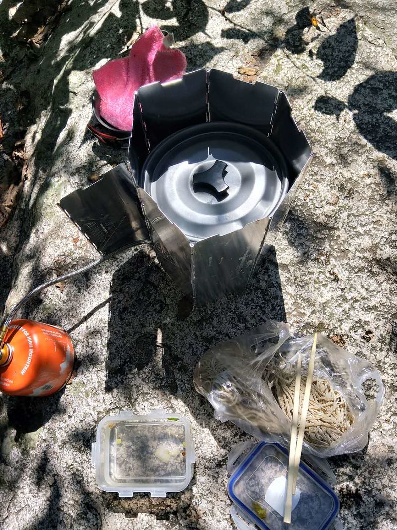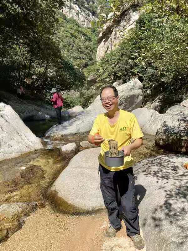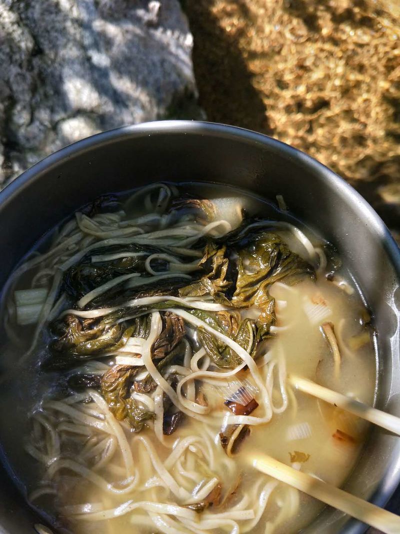 油炸葱花芝麻叶,绿豆面条准备早 泉水面条只一碗,晒着太阳肚子圆 随便溜达赏风景,慢慢悠悠下了山 爬山烦恼随风去,回家好好去上班 再遇休息再爬山,谁与看花约着玩
