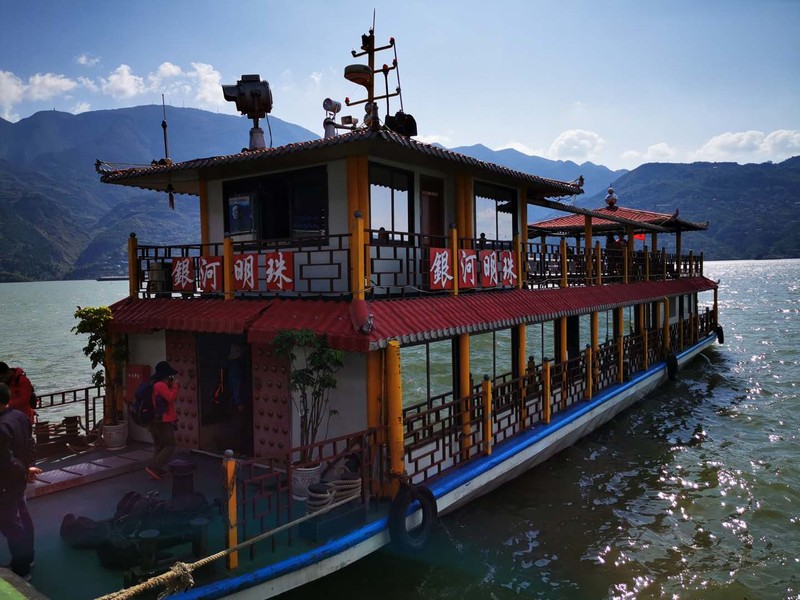 换乘小船,画舫那种,开始深入瞿塘峡内,我们企图找一个岸边停靠,来满足徒步的欲望。 夔门城楼离我越来越远,心中涌起一丝激动。