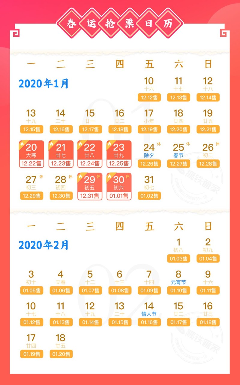 2020年春运从2020年1月10日开始至2月18日结束。12月12日(下周四)开抢春运首日火车票。