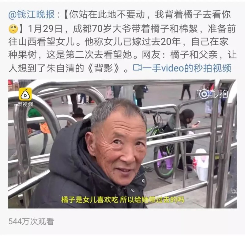 这段被拍客随手而拍的视频,让人想起朱自清先生的《背影》,也感动了很多在外漂泊的游子和远嫁他乡的女儿。