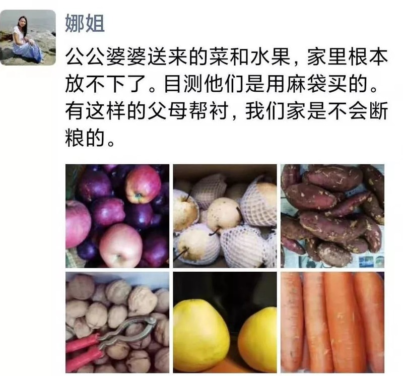 原来,这周末我回家,随口说了句,忙起来时连买菜的时间都没有。公公婆婆听罢,跑到水果蔬菜市场,买了一袋又一袋,一箱又一箱,给我们送来。