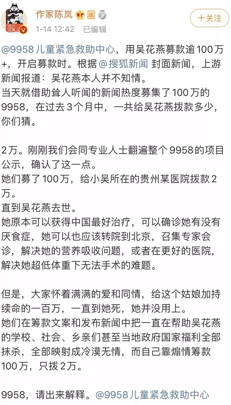 我知道的是,吴花燕去世后,作家陈岚爆出一条惊人消息: