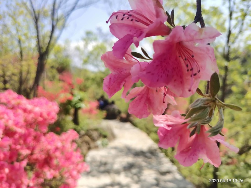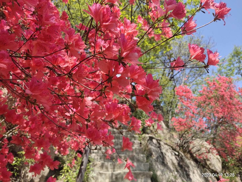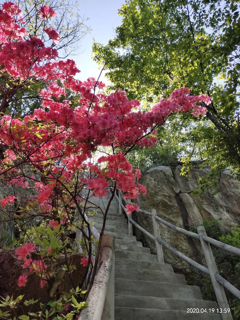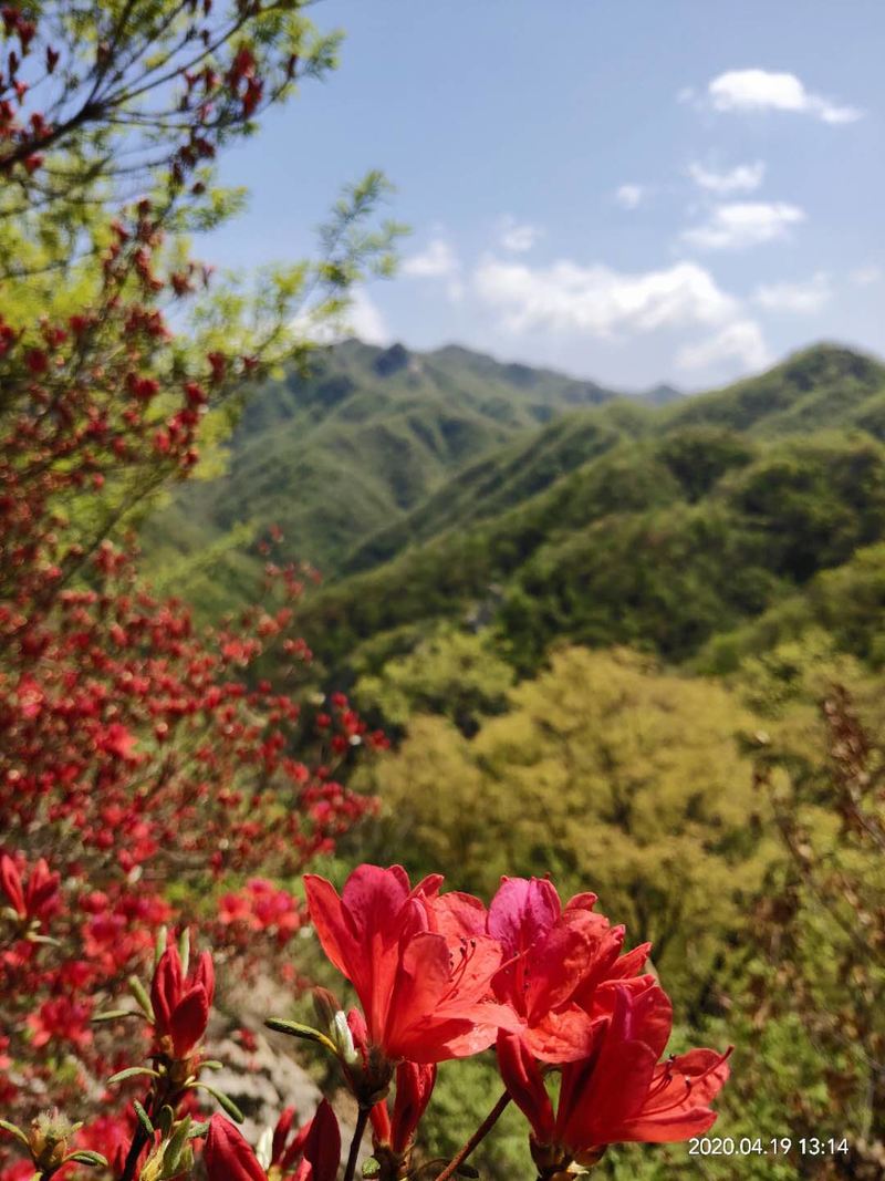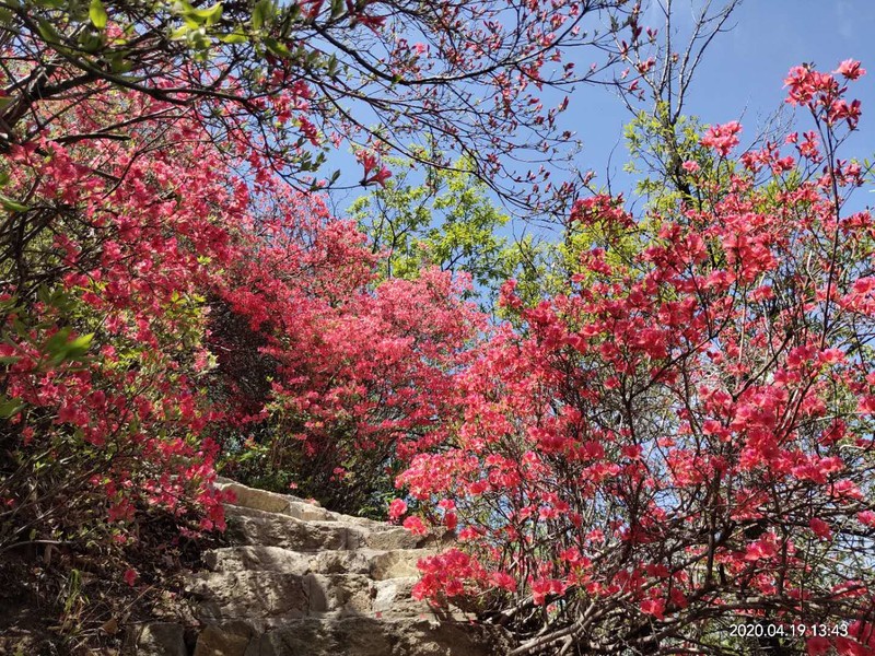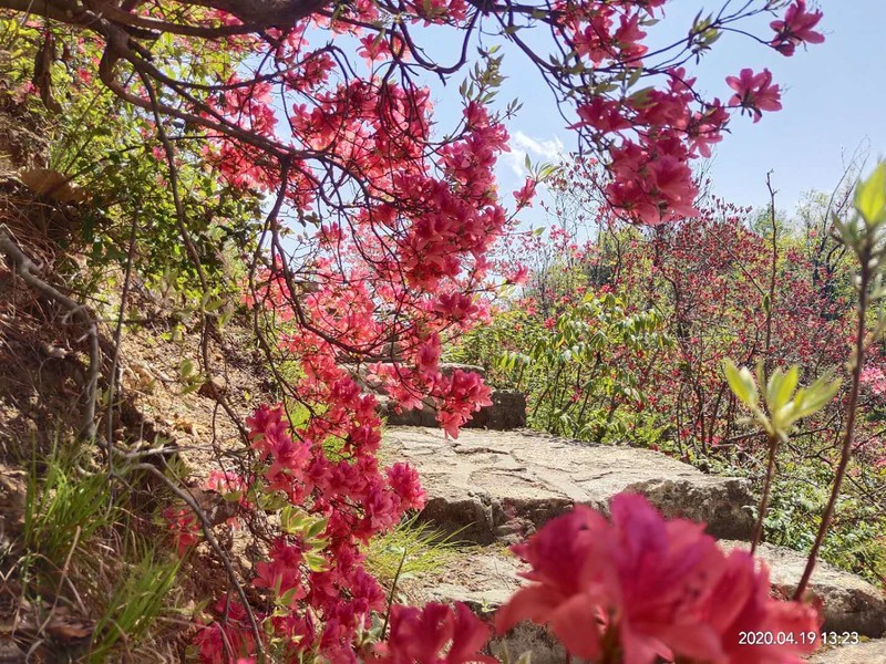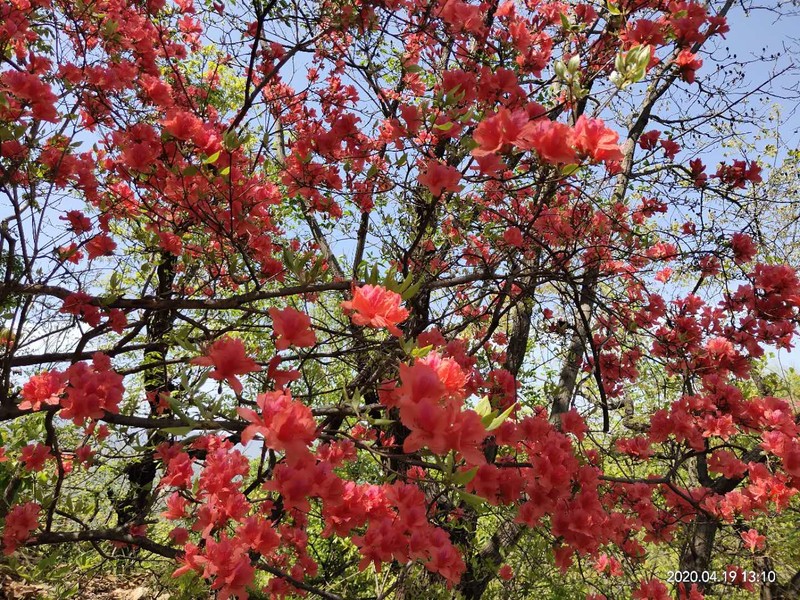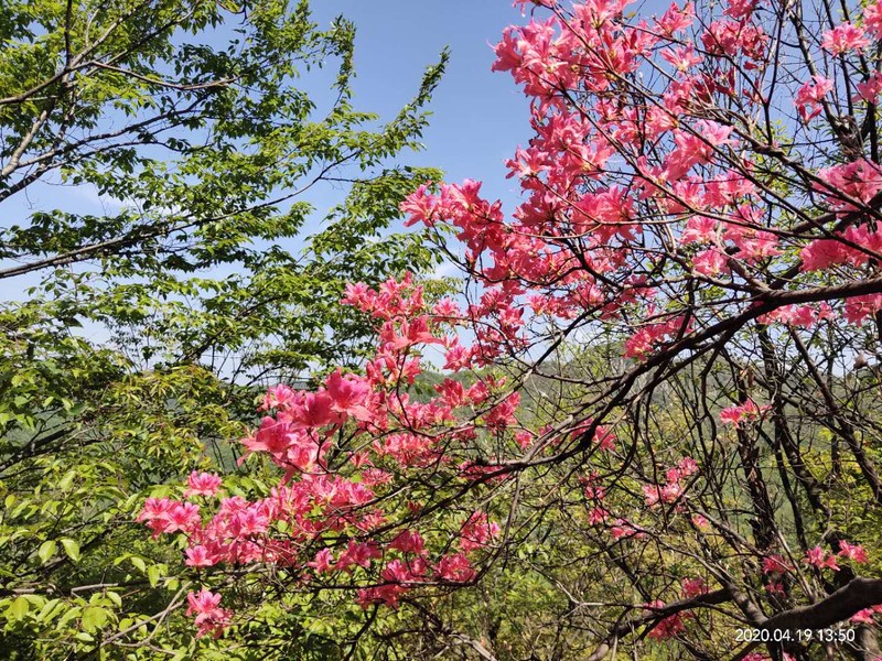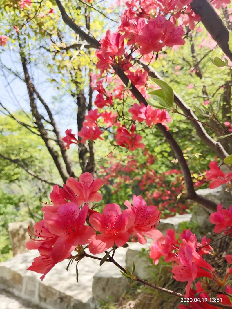 四五月的诗景龙潭峡,一片芳菲,花香满径。随着天气的变化,山上各色杜鹃次第进入盛开期。漫山遍野、五彩缤纷,红如血、白似雪、粉若霞,如诗如画,似梦似幻,眼前的红肥绿瘦,惊呆了爱人,尖叫了旅伴,我也顺手拍下眼前的美颜,让爱随心飞,愿花期绵长! 我们走进山中没有多远,就被一片杜鹃花林所吸引。满眼的映山红,难得还有两棵紫杜鹃。爱臭美的人已经拍照舍不得走了。