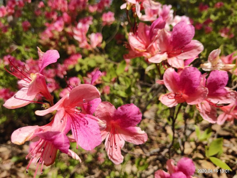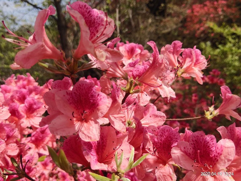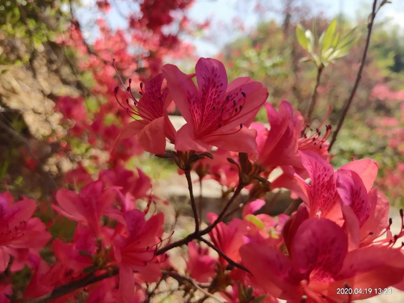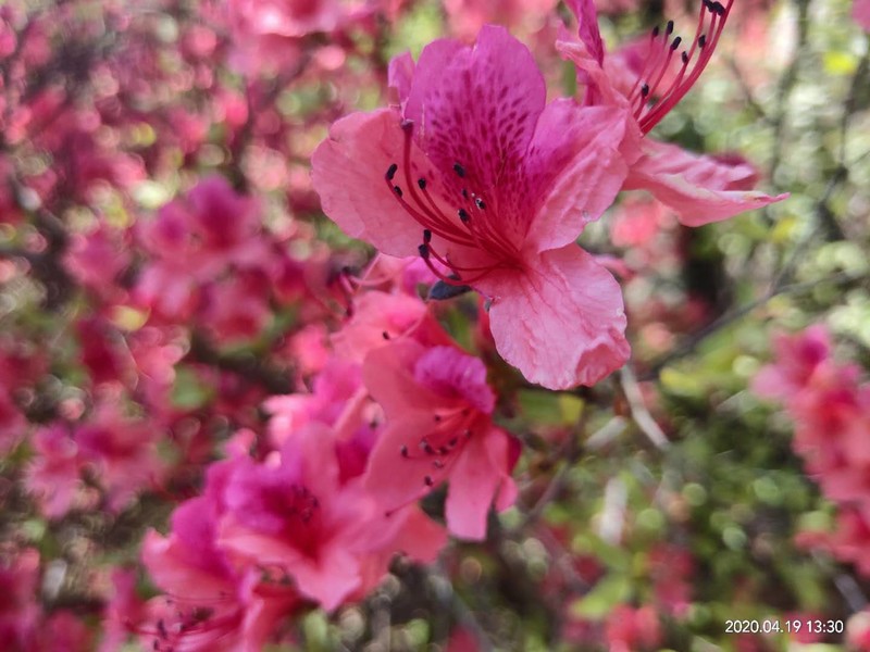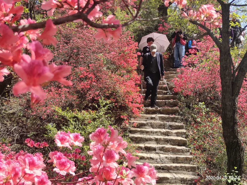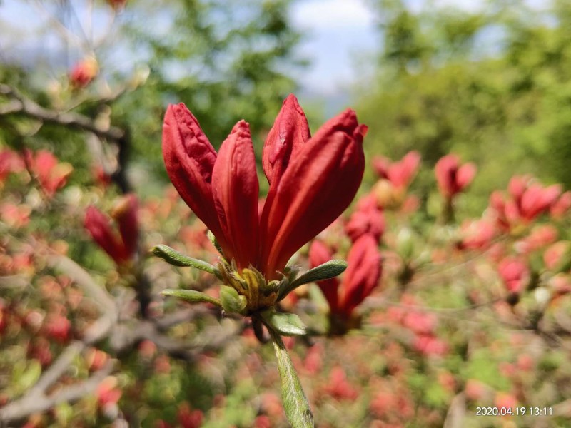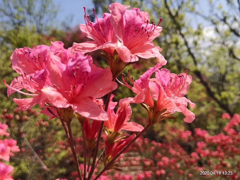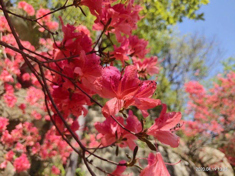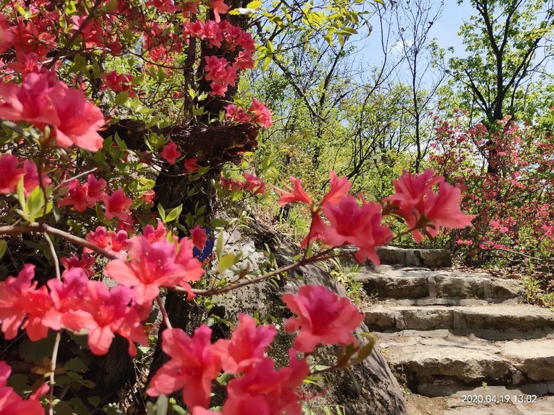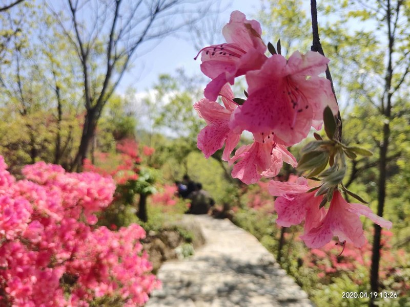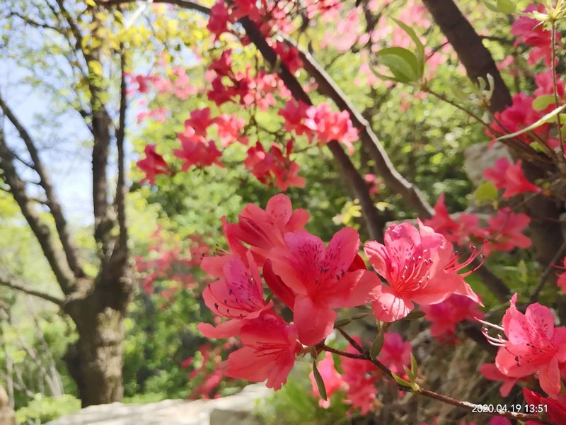 四五月的诗景龙潭峡,一片芳菲,花香满径。随着天气的变化,山上各色杜鹃次第进入盛开期。漫山遍野、五彩缤纷,红如血、白似雪、粉若霞,如诗如画,似梦似幻,眼前的红肥绿瘦,惊呆了爱人,尖叫了旅伴,我也顺手拍下眼前的美颜,让爱随心飞,愿花期绵长! 我们走进山中没有多远,就被一片杜鹃花林所吸引。满眼的映山红,难得还有两棵紫杜鹃。爱臭美的人已经拍照舍不得走了。