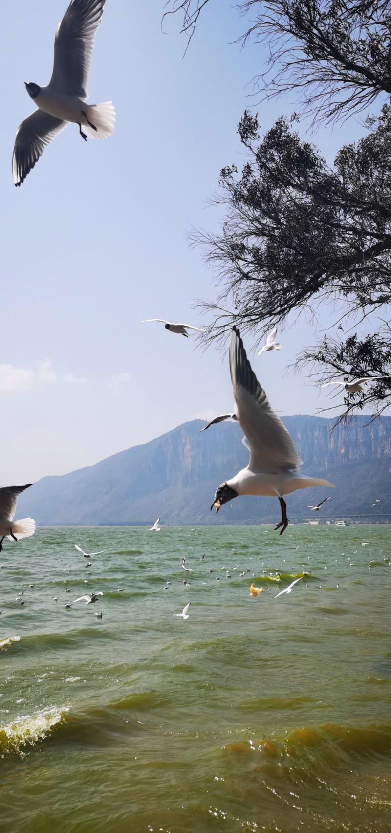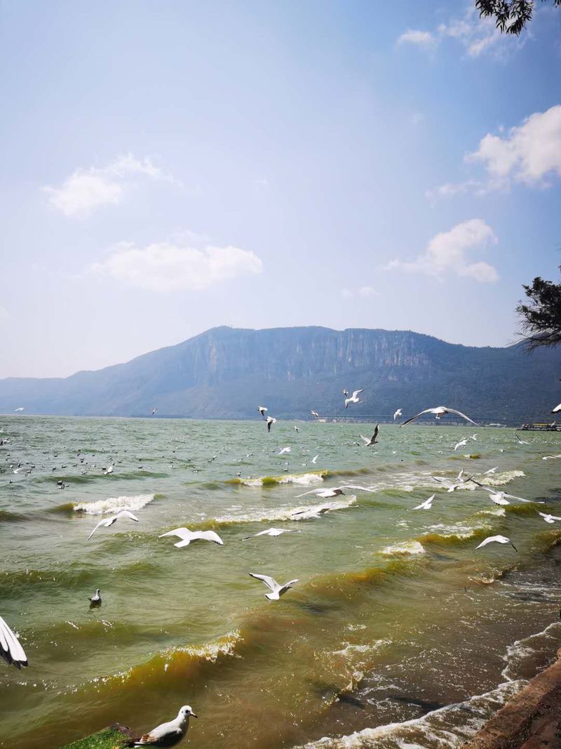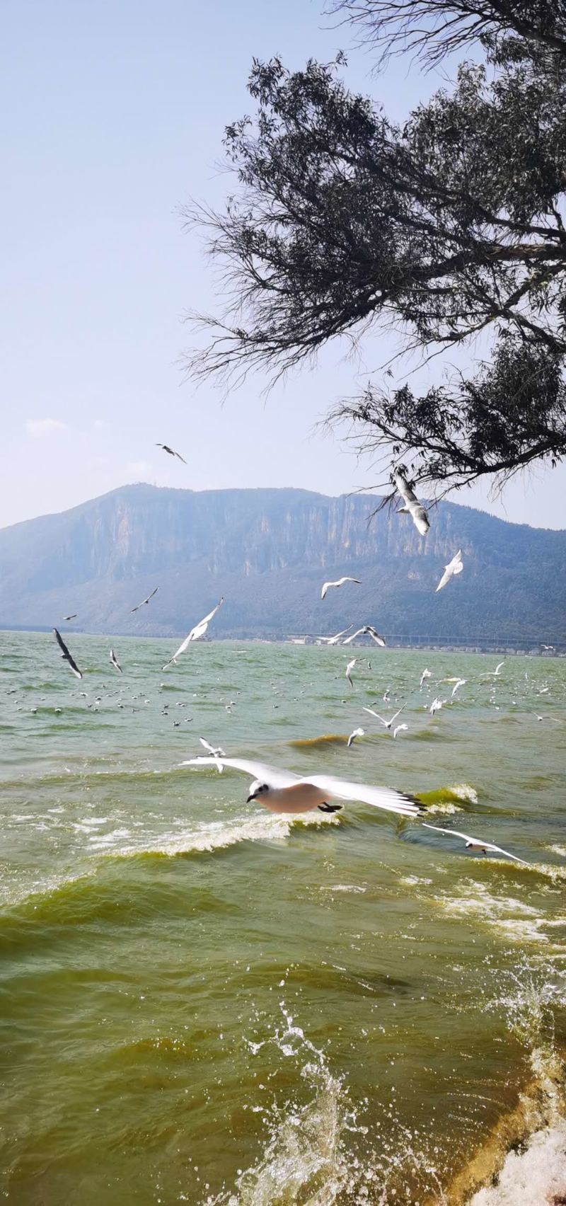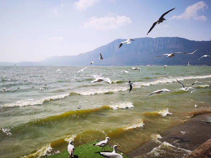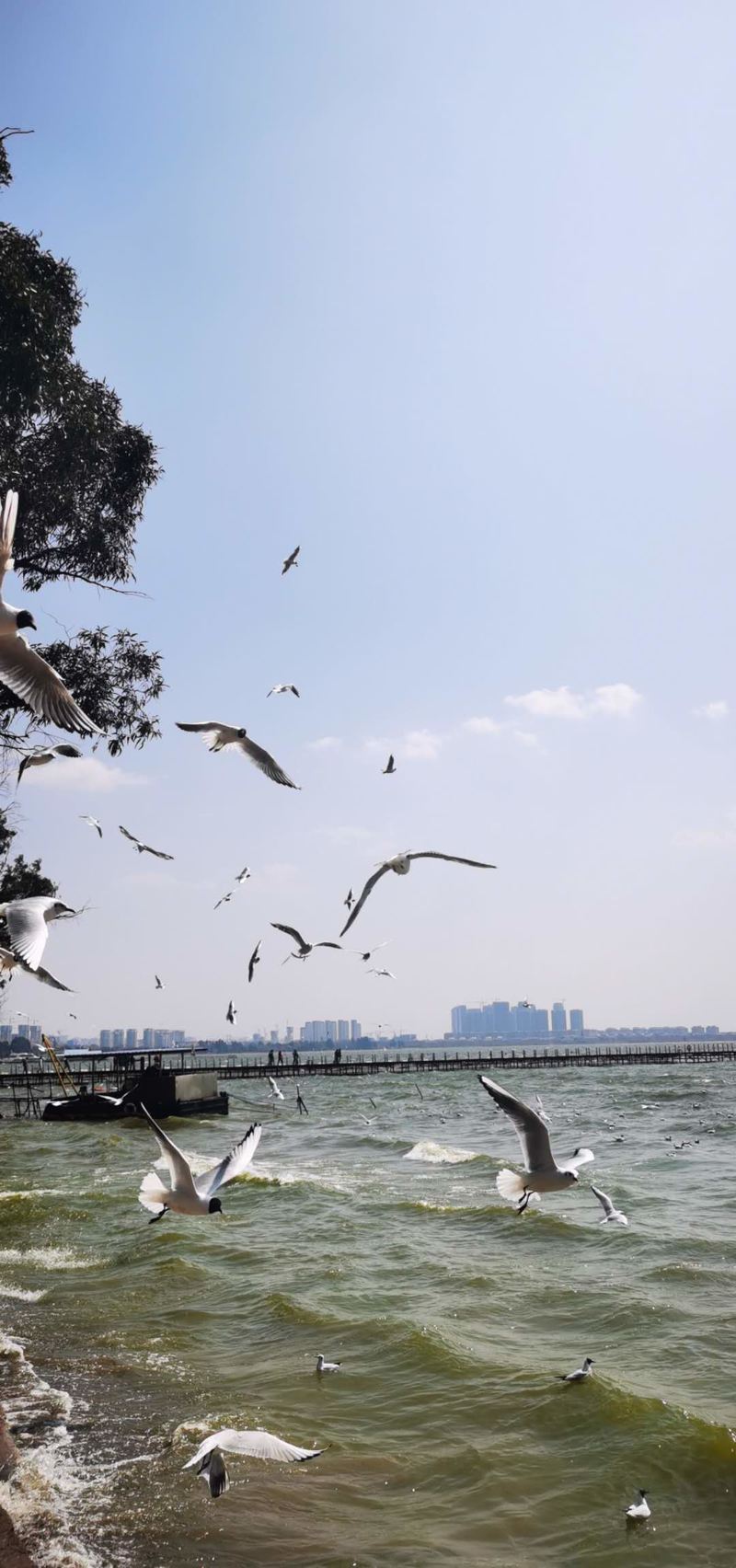 这画面,这情景,海天一色,人鸟和谐相处。远方的青山耸立,滇池的浪拍打这岸边。海鸥飞过,叨走人们举手为的面包。