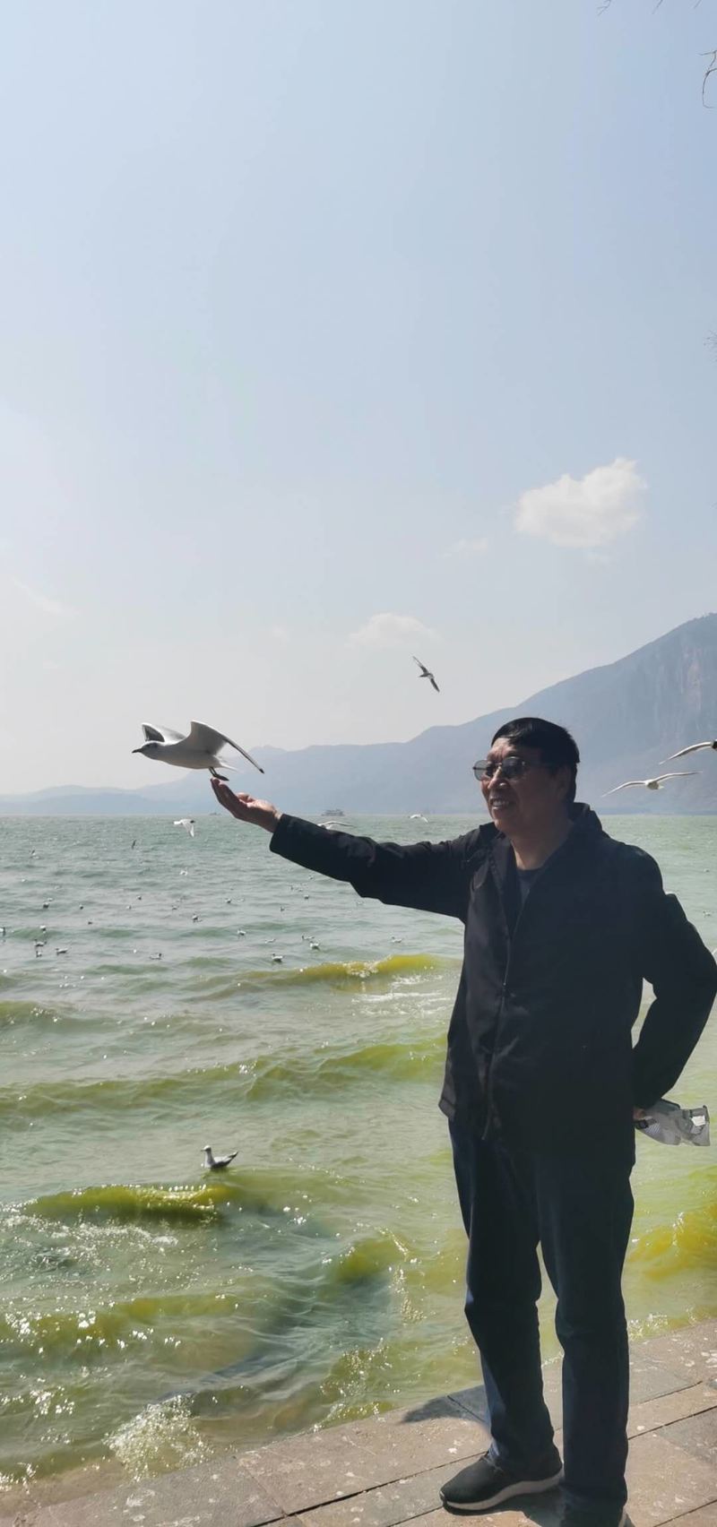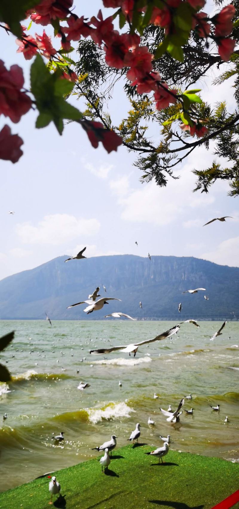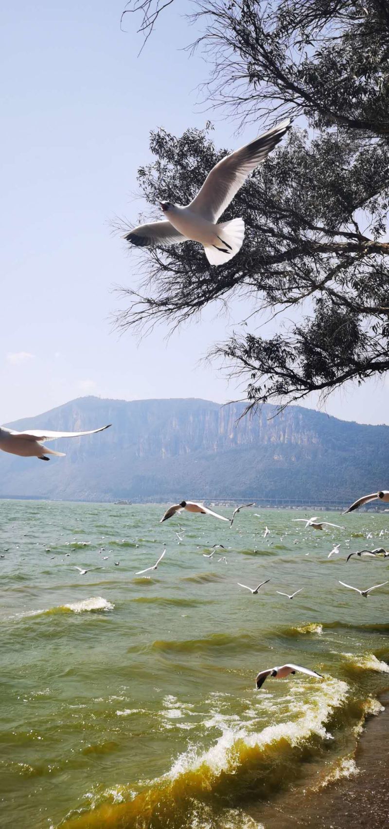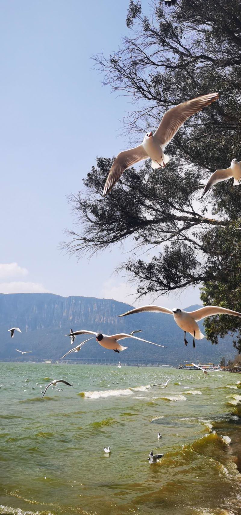 这画面,这情景,海天一色,人鸟和谐相处。远方的青山耸立,滇池的浪拍打这岸边。海鸥飞过,叨走人们举手为的面包。