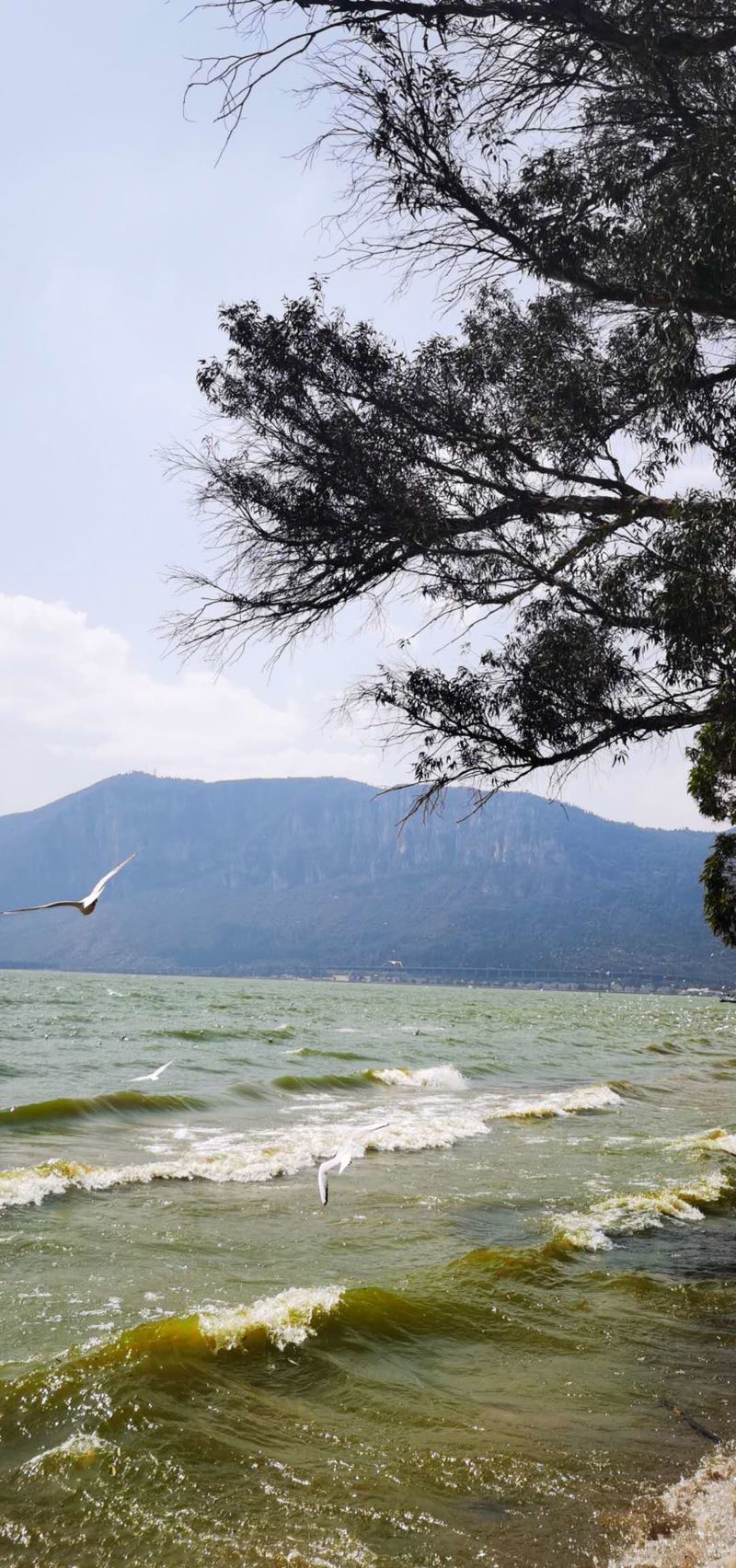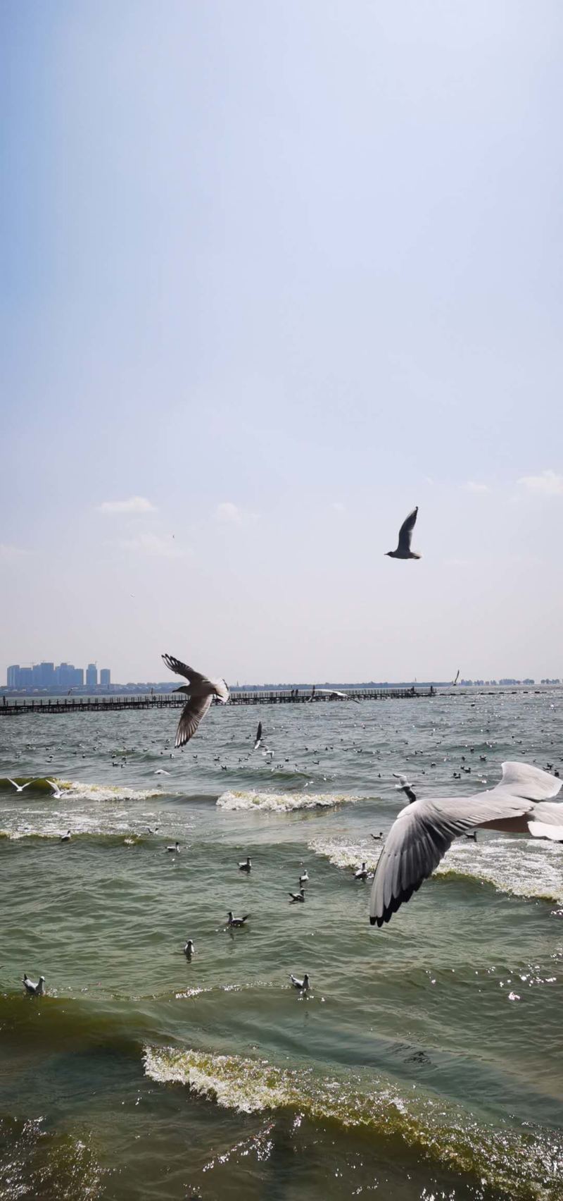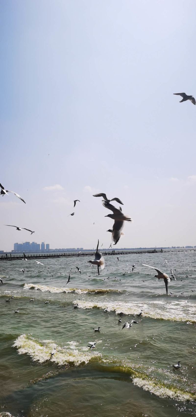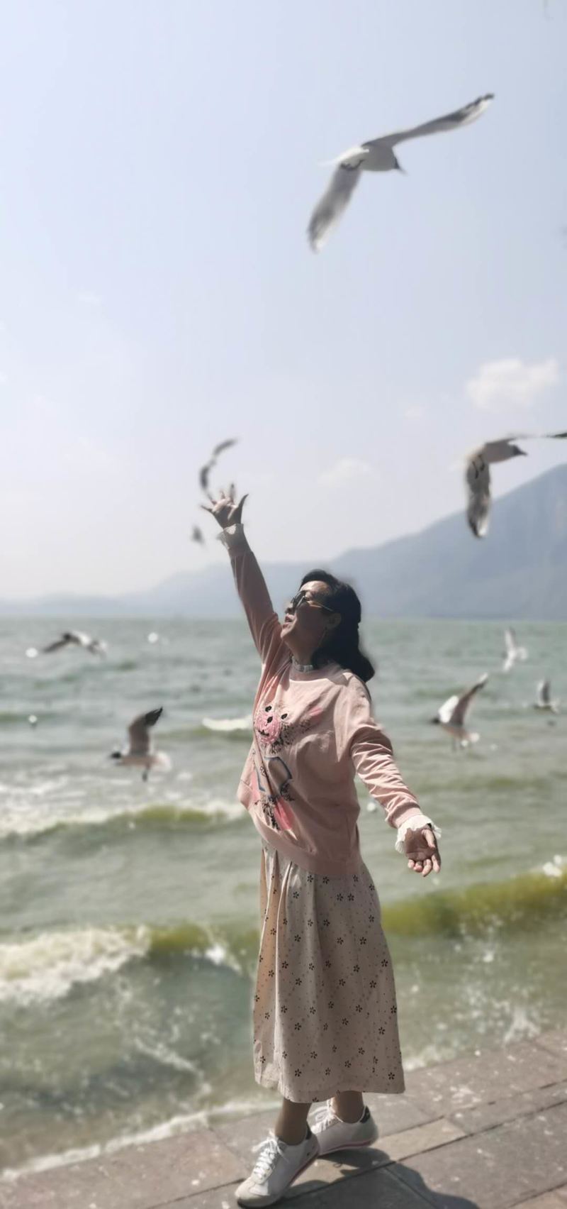 这画面,这情景,海天一色,人鸟和谐相处。远方的青山耸立,滇池的浪拍打这岸边。海鸥飞过,叨走人们举手为的面包。