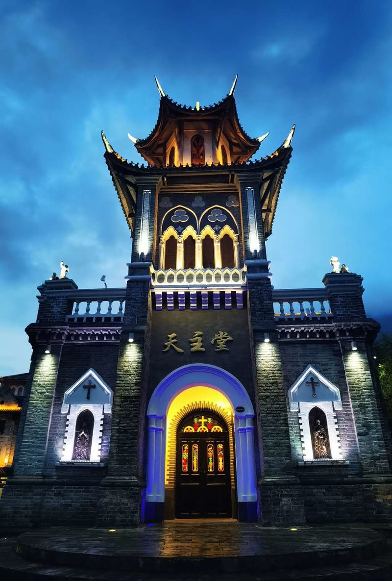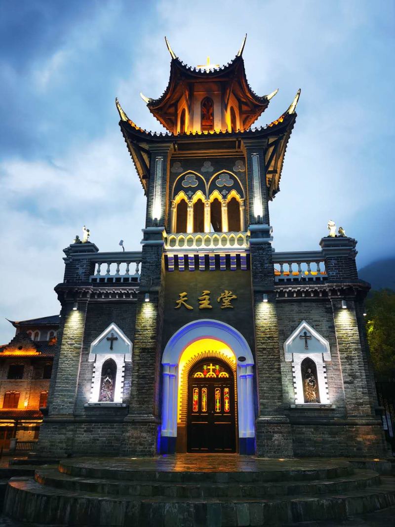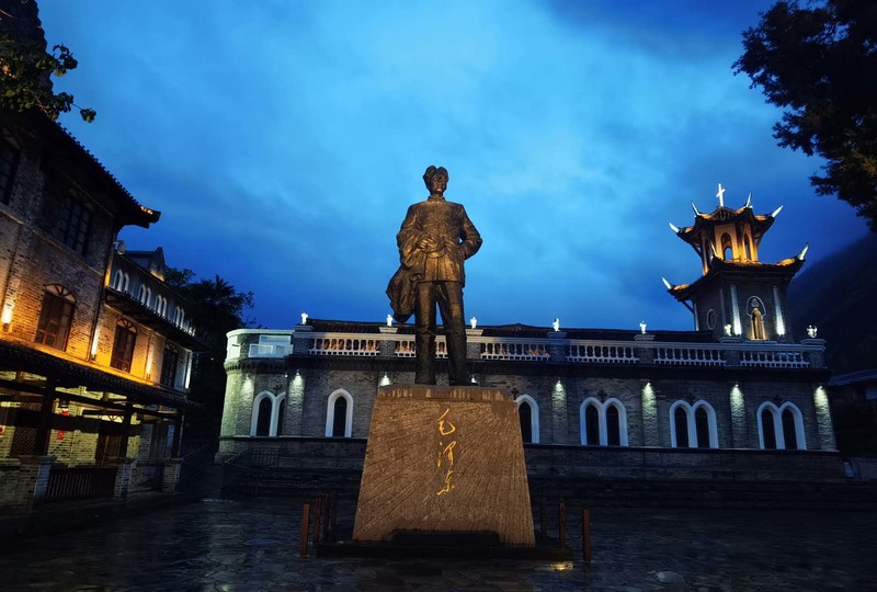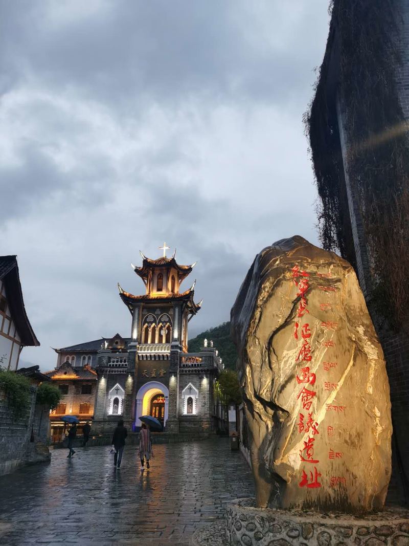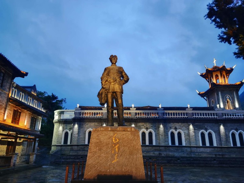 翻过了雪山,越过了草原。一路前行,过康定,走泸定,晚上入住磨西古镇。 古镇建在一个东西北三面绕水环山的倾斜高台平地上,古镇入口岔成两条马路。一条通往古镇,一条穿过新城,绕城后汇合成一圈。石板铺设的古镇上,楼房紧挨着聚集于路两边。古民居实际上已不多见,较具特色的是1918年法国传教士修建的天主教堂。 1935年,红军长征路过此地,毛泽东主席下榻于天主教堂内,召开了著名的磨西会议。随后,红军抢夺泸定桥,毛主席跟随红军主力渡过了泸定桥。