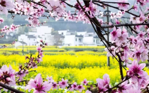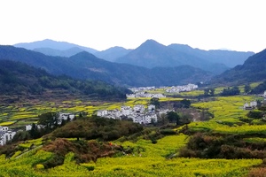 江西婺源的油菜花就是这样一种意韵,江西婺源被誉为"中国最美的乡村" ,余邵诗云:“油菜花开满地黄,丛间蝶舞蜜蜂忙;清风吹拂金波涌,飘溢醉人浓郁香”。花粉中含有丰富的花蜜,常引来彩蝶与蜜蜂飞舞于花间,由此平添了乡间田园缤纷的景致。三月中下旬,棵棵粉红的桃花、洁白的梨花点缀在漫山遍野金黄色的油菜花中,掩映着白墙灰瓦的徽派建筑,使得每一个逃离纷繁城市的人都能找到归宿。