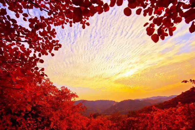 黄岗红叶,历经冬、春、夏、秋的蛰伏又悄然红透了革命老区大别山脉。闪耀着耀眼的红色喜庆,像温暖的轻吻,像火热彩霞,呼唤着远方金色的田野,满山的火红映透天际,照亮了美丽的秋天。"一年一度秋风劲,又见黄岗红叶红”
