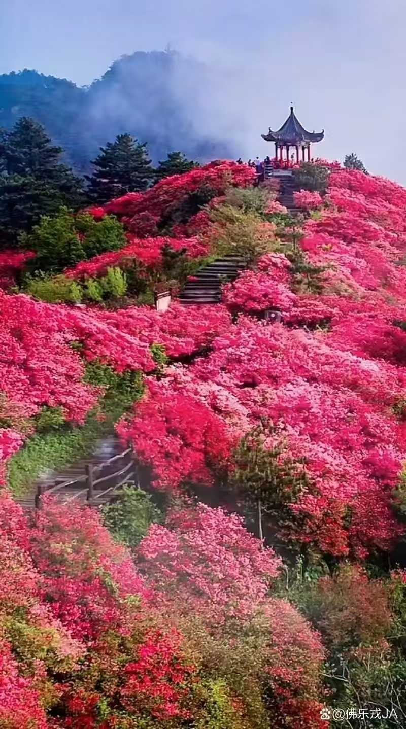 龟峰山位于湖北省麻城市,以其壮观的杜鹃花海闻名,被誉为“世界杜鹃公园”和“大别山上最美红飘带”。拥有连片面积达10万亩的古杜鹃群落,是世界上最大的古杜鹃花海之一,平均树龄百年以上,部分植株树龄超过600年。杜鹃花盛开时,整个山峦被红色花海覆盖,如红绸缎带环绕山间,晨光和夕阳下更是美不胜收。