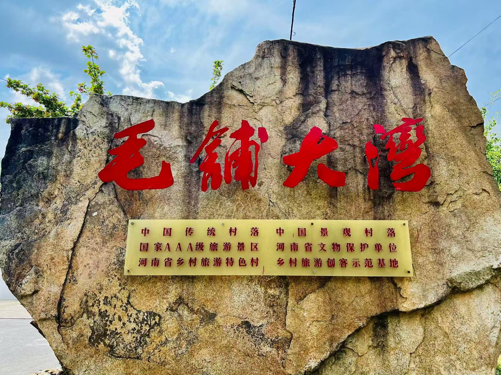 毛铺大湾地处大别山腹地,是淮河重要支流之一白露河的发源地。2013年入选中国传统村落、中国景观村落,2016年被认定为河南省文物保护单位。2020年又先后被评为河南省乡村旅游创客示范基地、国家3A级景区。首先是古道、古寨、古民居。古道指贯穿毛铺村全境的汉潢古道,古寨包括村东面的白云山寨、西面的大福寨(打鼓寨)、南面的李寨等关寨遗址,古民居即豫南规模最大、保存最完整的明清古民居建筑群。同时,还有世代相传的非遗文化“古法三绝”,即古法榨油、古法制香和古法做烟。