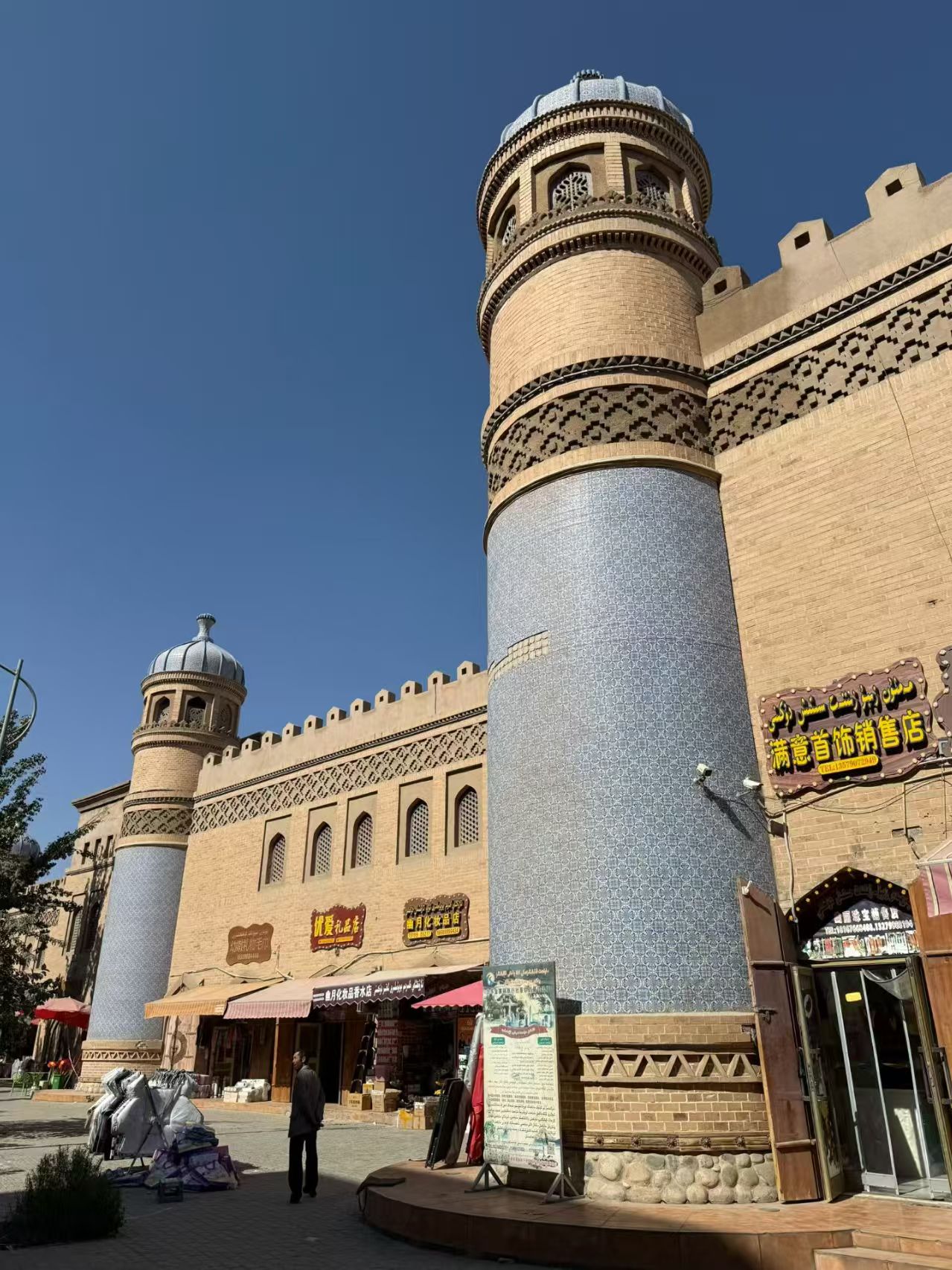 伊斯兰风格建筑群:蓝色穹顶、拱形廊道与现代工艺结合,丝绸之路观光塔(80米高)融合古罗马柱式元素,成为乌鲁木齐地标。