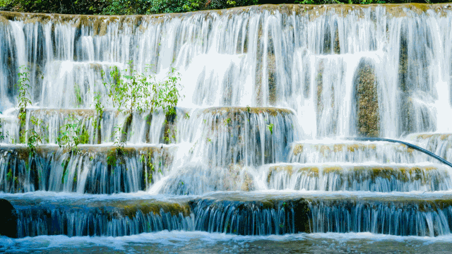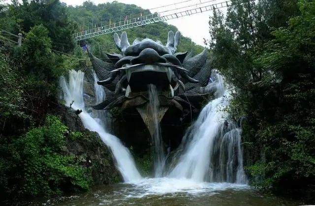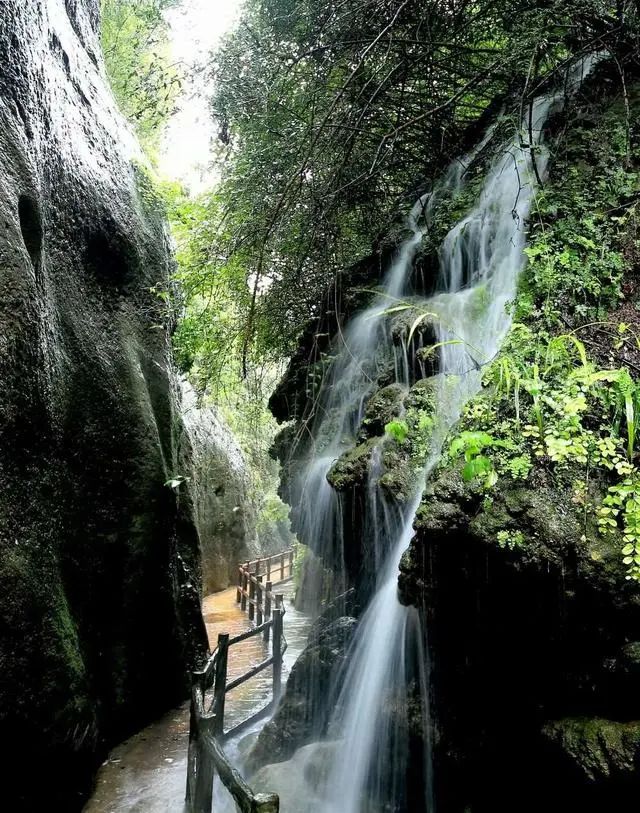 沿着步行栈道,一路在峡谷中蜿蜒前行,景区内水流滚滚,奔腾轰鸣,伴随着巨大的水声可见一道道飞瀑飞流直下,拍击在山石上,溅起点点水珠,顿时让人感觉到阵阵清凉。来到"上善若水"景观处,一条白色的瀑布如一条银练悬挂山间,蔚为壮观。