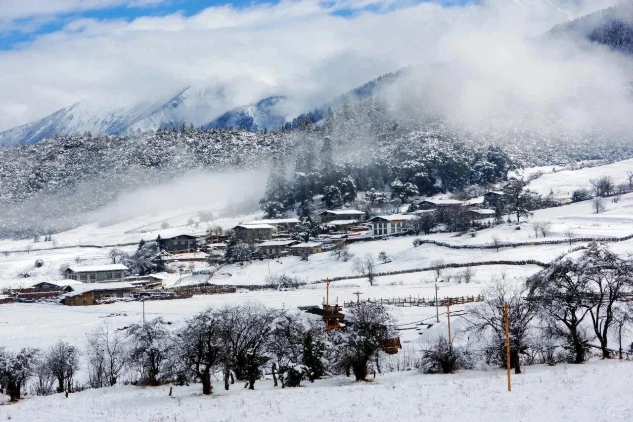 【鲁朗小镇】冬日鲁朗,林海覆雪,藏式木屋裹上银装,是雪域里的温柔童话