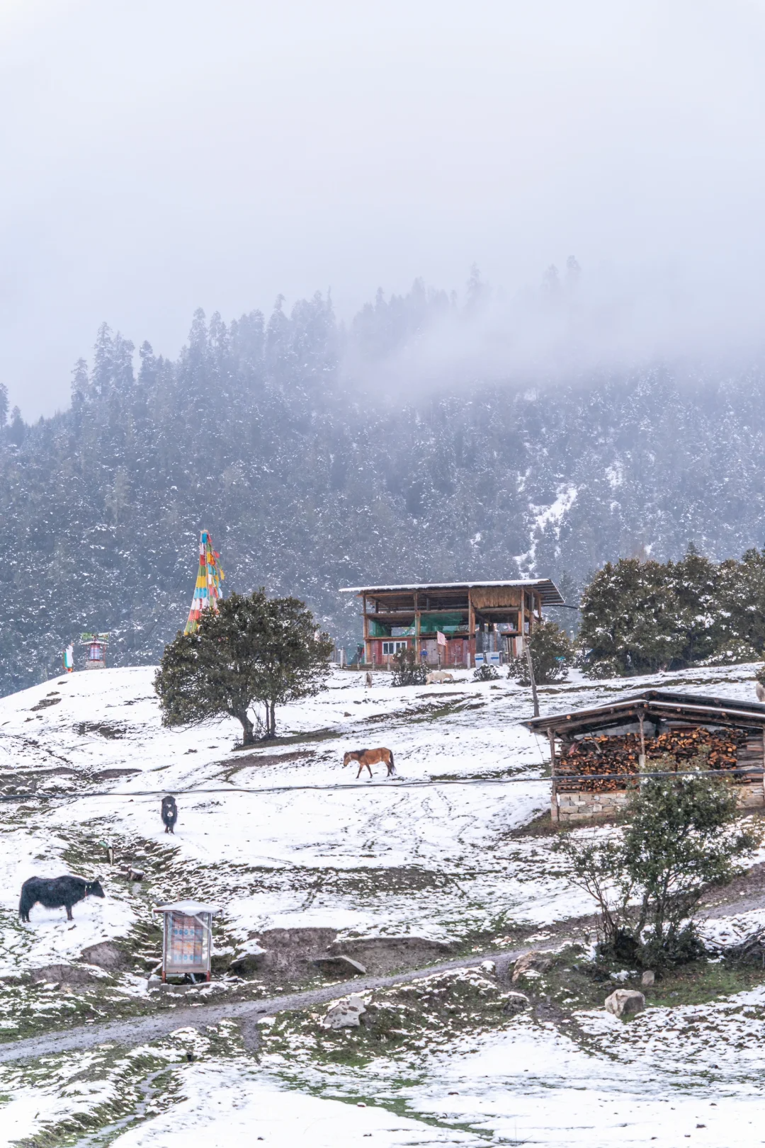 鲁朗这里被称为中国小瑞士,森林、雪山、湖水、村庄,堆叠在一起,变成一个安逸宁静的小世界。冬日里色彩退却,风雪来临,这里就成为童话世界。