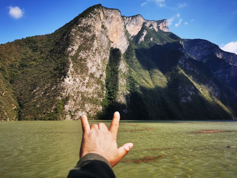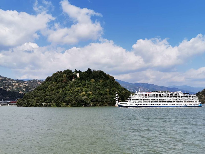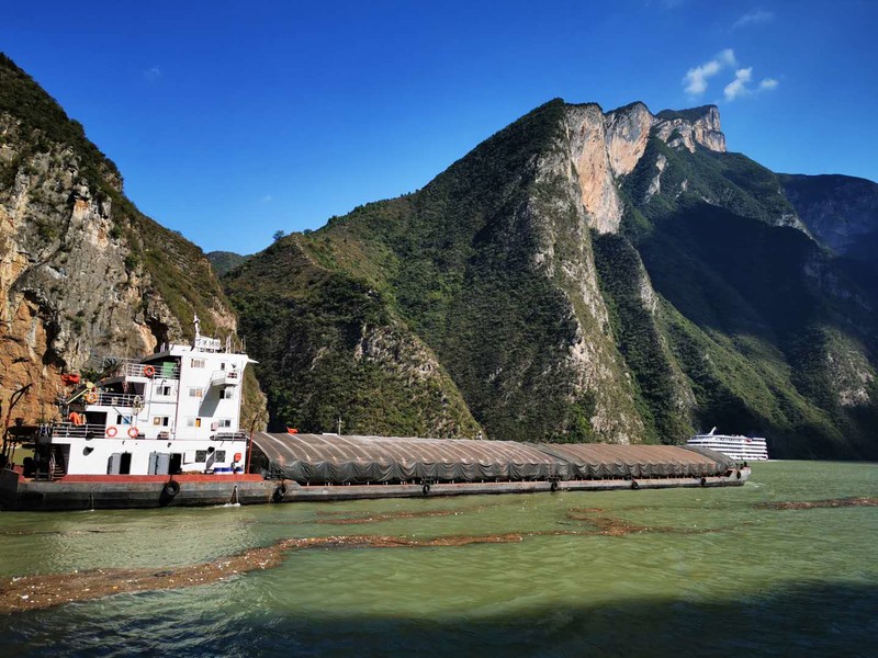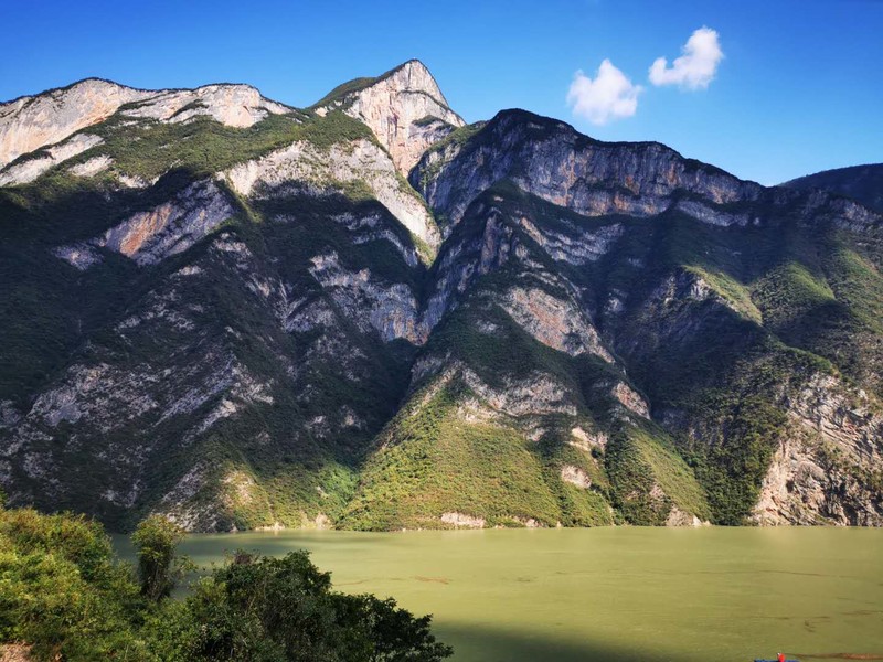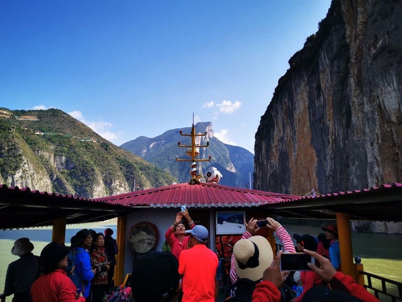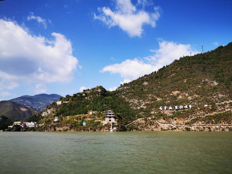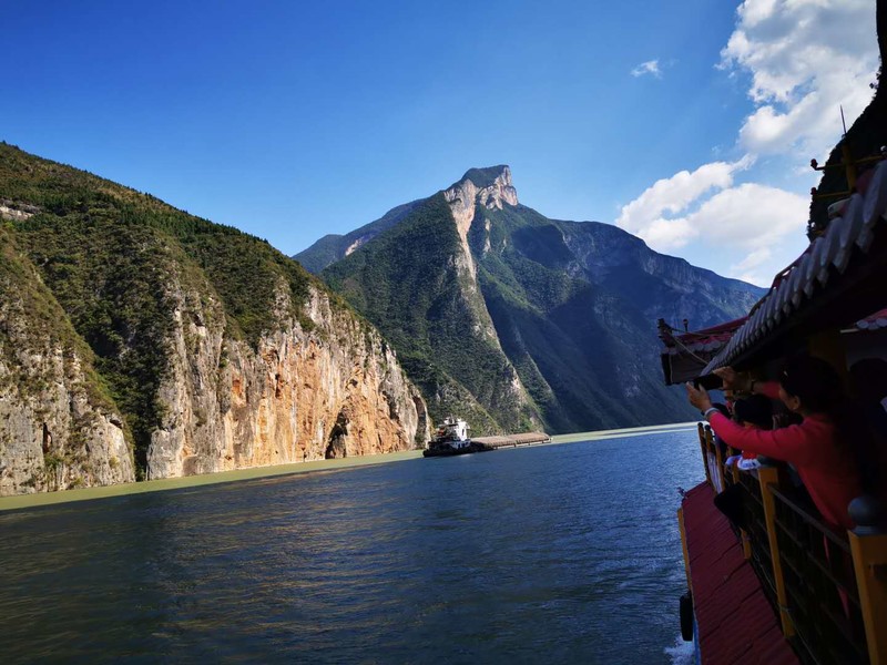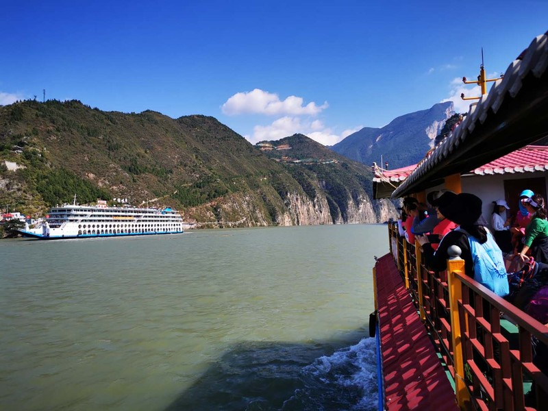 说实话,徒步三峡组织起来非常复杂,数不清的换乘小车,小船,大船,不过这也增加了很多趣味性,在瞿塘峡入口处不时遇到从宜昌开往重庆的豪华游轮,楼顶狂欢的人们似乎有点不理解这帮背包客们为什么要来徒步三峡。 远处的小岛就是白帝城,白帝庙由于修建在山顶,因此没有被淹没。