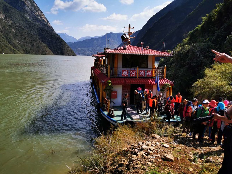 小画舫在一个不知名的地方停下了,我们在这里下船,开始徒步瞿塘峡的白盐山。 这些都是来自全国的户外俱乐部负责人,都是具有原创设计线路能力的创始人,我们试图通过自己亲自体验,来测试一下这条徒步长江三峡线路的科学性。