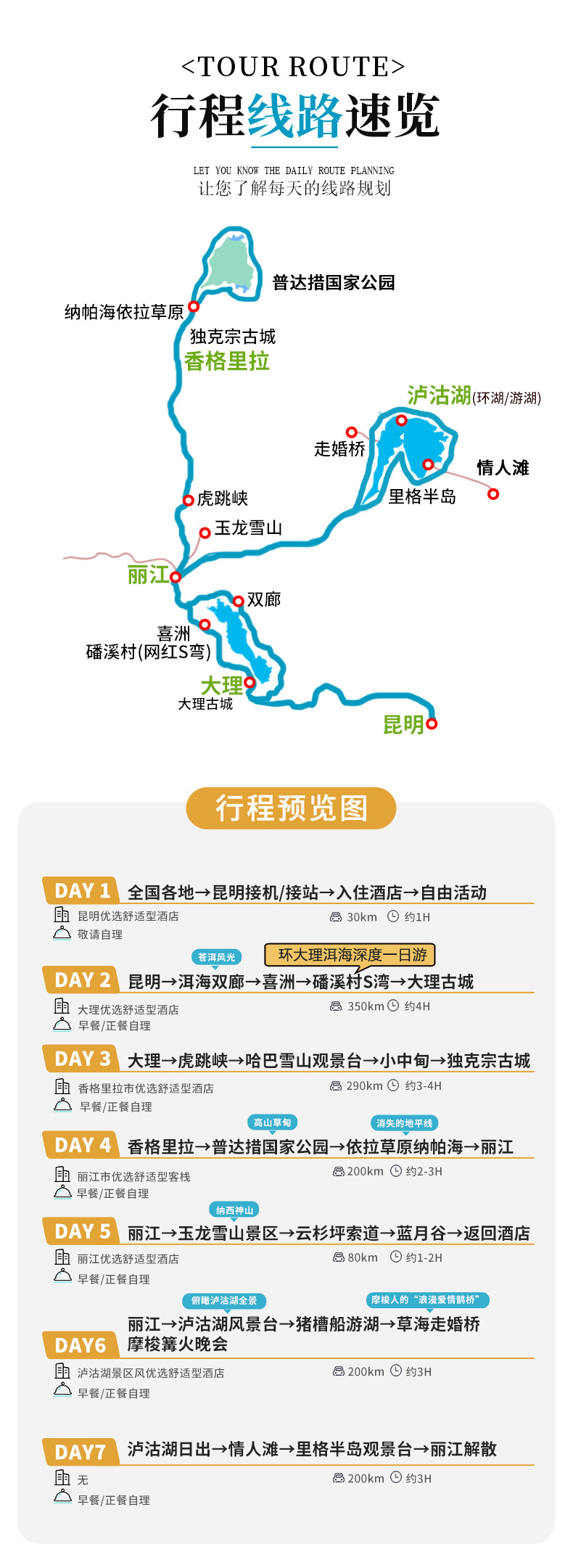 交通:不包含各地到达昆明集合、丽江散团的往返大交通费用(如:机票和高铁火车票等,提前预定通常折扣都会很低);