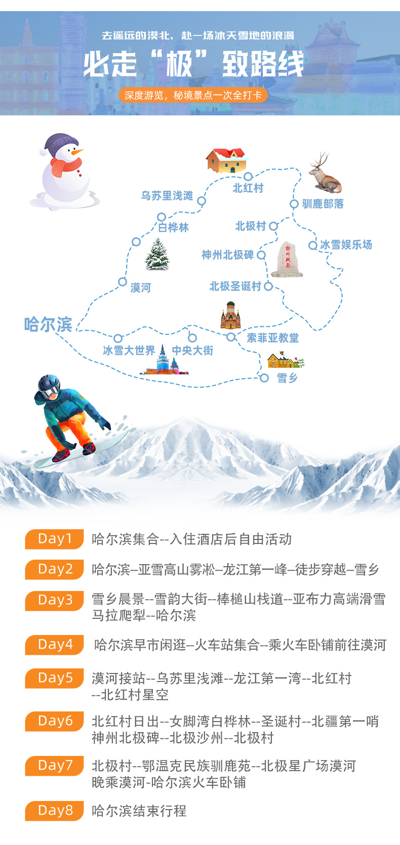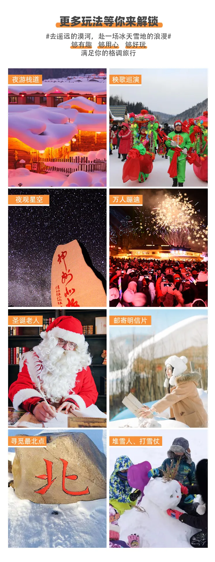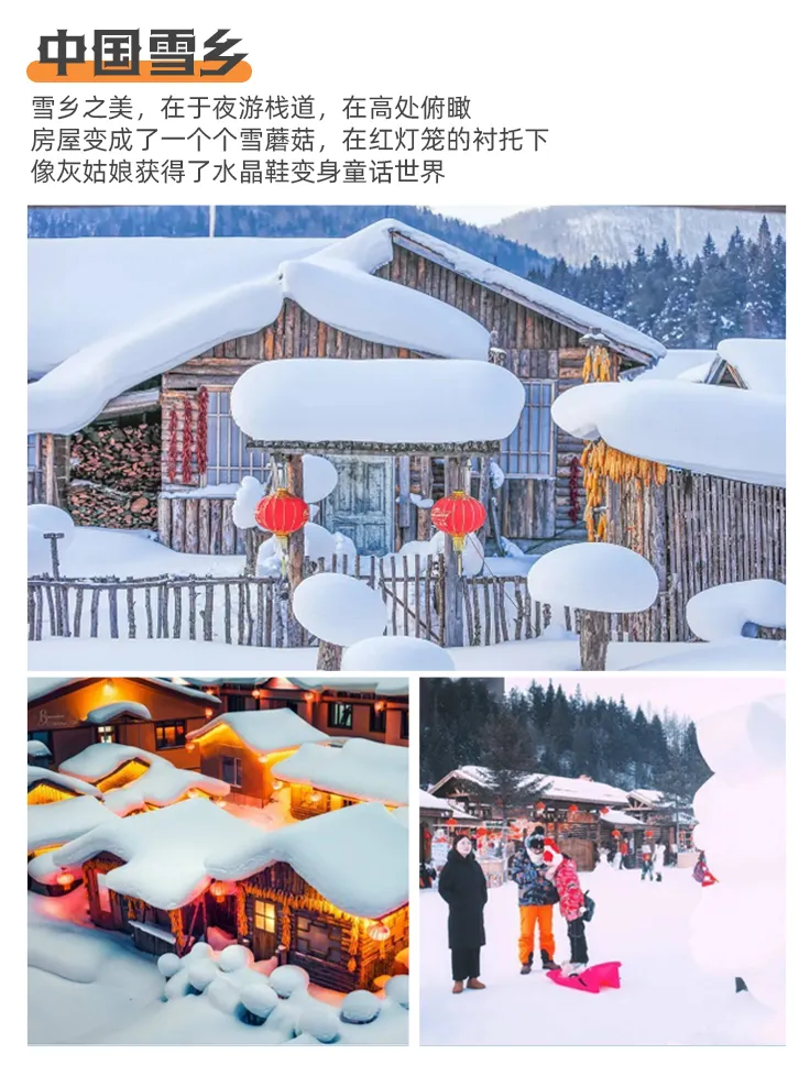 5、全程门票费:亚布力初级滑雪3小时(包含雪板、雪鞋、雪仗)、雪乡门票+景交车、北极村门票、圣诞村门票、龙江第一湾+乌苏里浅滩门票、驯鹿苑门票