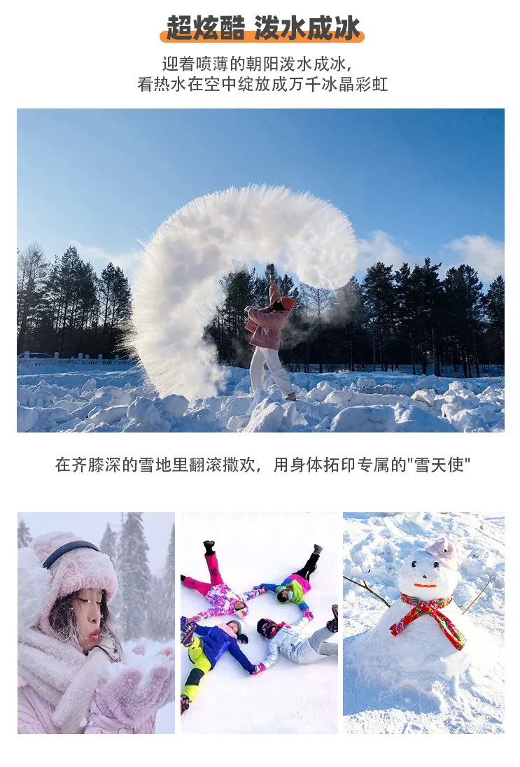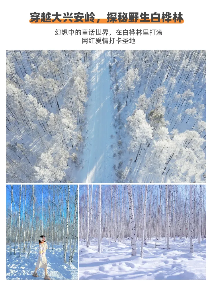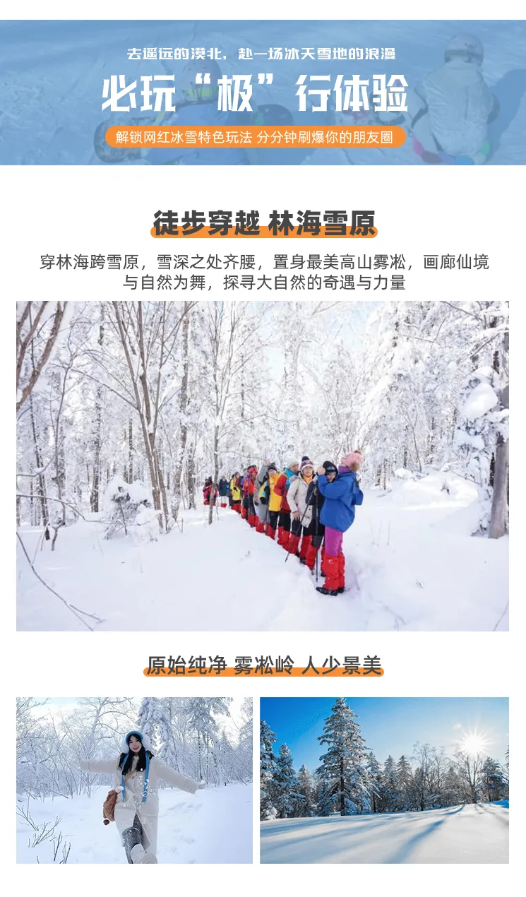 亮点一、徒步穿越 林海雪原 亮点二、亚布力滑雪度假区滑雪(免费提供:滑雪鞋、雪板、雪杖) 亮点三、夜拍星空,探寻极光出现的村落 亮点四、照呗行动,寻找最北之北(最北村落,最北邮局,最北人家,最北哨所,中国北极点) 亮点五、探访鄂温克驯鹿园,北国森林精灵 近距离喂食驯鹿 亮点六、穿越大兴安岭,探秘野生白桦林,在白桦林里打滚 亮点七、北红村日出,泼水成冰是零下40℃的专属快乐