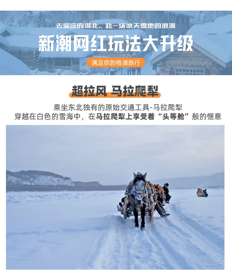 备注:马拉爬犁每年12月下旬至2月下旬冰面厚度达到安全标准后赠送;赠送项目因天气、交通、政策等非人为原因或游客自身原因不体验,导致赠送项目无法赠送体验的,不退费。