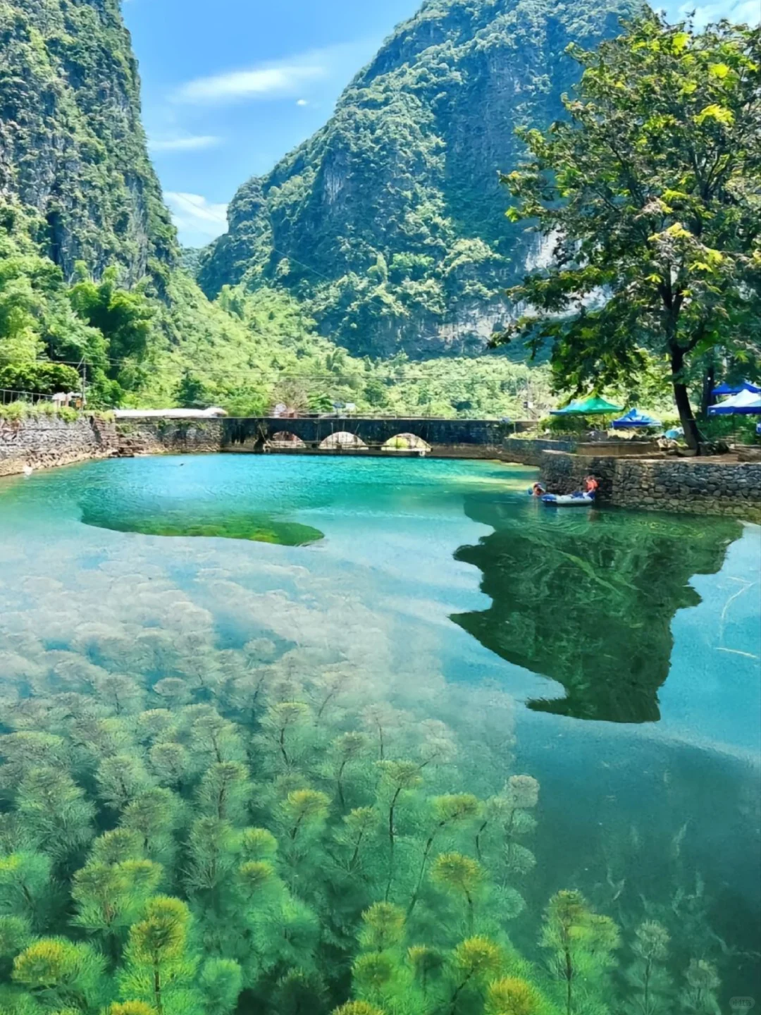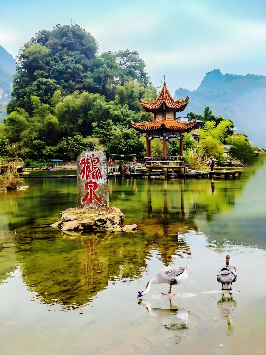 鹅泉:鹅泉位于靖西市,自古就是靖西八景之一,绿水青山、亭台楼阁、乡村田园,在这里都可以感受到。“鹅泉跃鲤三层浪”的传说、明代皇帝赐封的“灵泉晚照”古石刻,更是给这里添了一份迷人气息。进入景区大门后,沿着河畔走着,一面是高耸的山峰,一面是平坦的农田,而鹅泉就像一块明镜,倒映着两岸美景,让人心醉。