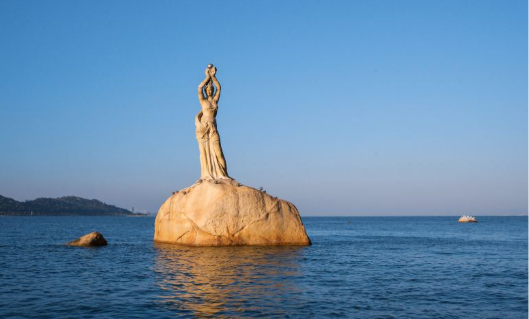 珠海渔女矗立在珠海风景秀丽的香炉湾畔,雕像身高约8.7米,由70余块花岗岩打造,是珠海的标志性景观。她领戴珍珠、身掮渔网,双手高擎着一颗浑圆硕大的珍珠状宝物,令人怜爱的神情栩栩如生。