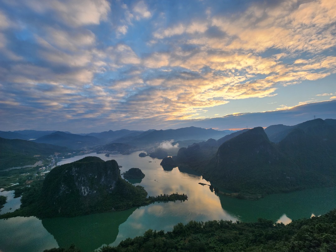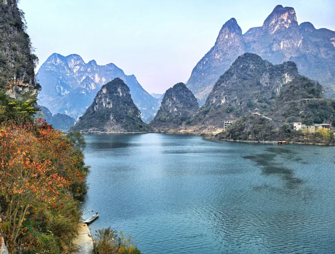 坡豪湖是红水河上因水电站蓄水形成的高峡平湖,素有“桂西千岛湖”之称。湖区水域辽阔,碧波如镜,岛屿星罗棋布,与四周层峦叠翠的喀斯特峰林相映成趣,构成一幅宁静秀美的山水画卷。乘船游湖,水天一色,白鹭翩跹,偶见渔舟轻荡,恍若置身世外桃源。四季皆宜的坡豪湖,春有烟雨朦胧,夏可避暑纳凉,秋赏层林尽染,冬享清幽静谧。这里远离喧嚣,空气清新,是亲近自然、放松身心的理想目的地。来坡豪湖,感受红水河的温柔与壮乡大地的诗意栖居。