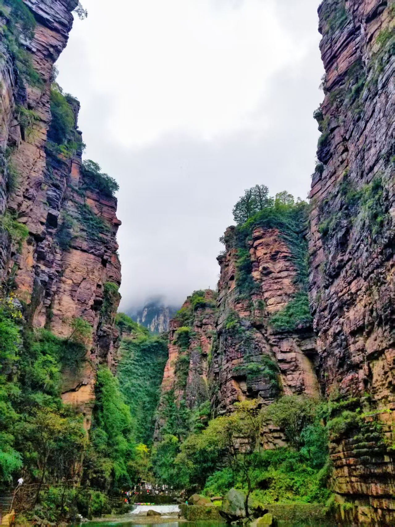 红岩绝壁约有200米高,耸直陡峭,象快斧整劈过一样,格调雄浑,令人生畏。头顶密布的 的乌云使峡谷更显磅礴大气,走在云梯上仰望山体无不被险峰所震慑,壁缝填满双眼。向上 只能看到上一层的石梯底面,向下只见峡谷中水浪翻滚,涛声回荡,煞有不上不下之感。由于我们不是专业攀岩者,在许多极险崖段,全凭自己的胆识和四肢去解决。多处石板已掉落 谷中,崖壁石缝里有许多小树和小草,它们都有一定的韧度,成为很好的“拉绳”,就这样 提心吊胆,磨破双手,足足忙了大半天才登顶。放眼望去,黑色的浓云威压着大峡谷,云层遮没了阳光,使山显得阴暗,山的阴暗又进一步衬托出云的阴暗。云和山,就这样浑然一体,我瞪大眦欲裂,也难以将这全景一眼望尽。