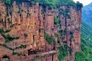 郭亮村位于海拔1700米的悬崖之上,几百年来,村民们都是通过一个“天梯”走出村子的,非常险要,基本上过着与世隔绝的生活。村里人在村支部书记申明信的提议下,由村中十三名壮劳力自发组成的凿洞突击队,在没有任何机械的情况下,用土法测绘,挥舞铁锤、钢钎,向绝壁上一锤一锤的凿去,打秃了钢钎12吨,打烂了8磅重的铁锤4000个,耗时五年半的时间凿成挂壁公路。当时上至70岁的老人,下至十几岁的娃娃都轮流到隧道里清理石渣,发扬的是“愚公移山”的精神,创造了人间又一奇迹。被誉为“第九大奇迹”、“世界最险要十条公路之一”、“世界十八条最奇特公路之一”。