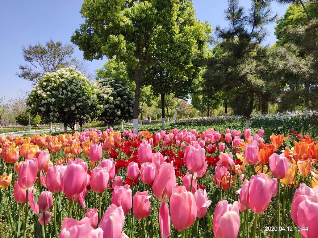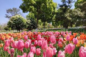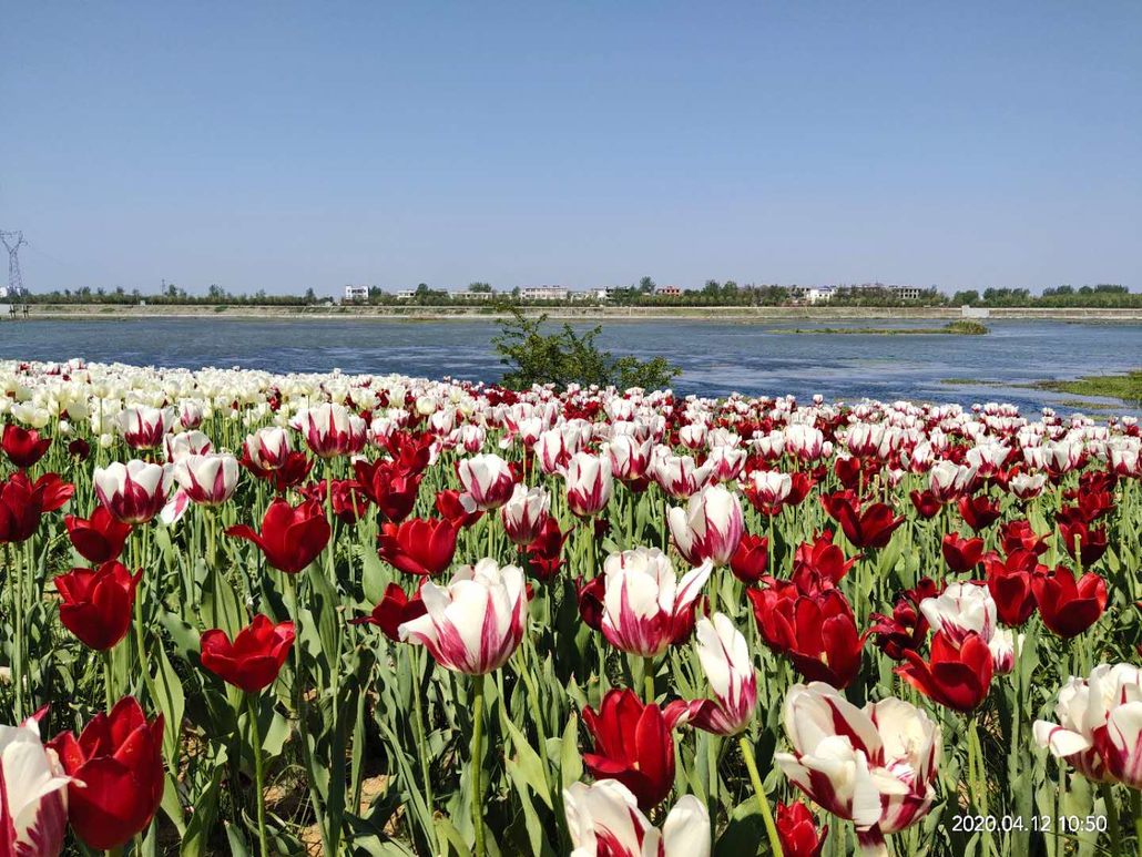 新野县白河滩湿地公园郁金香种植面积近五万余平方米,品种及栽种株数达100余种,百万余株。郁金香花色品系丰富,粉红、火红、玫瑰红、酒红、枣红,金黄、鹅黄、柿黄,洁白、乳白,黑色、紫色......等