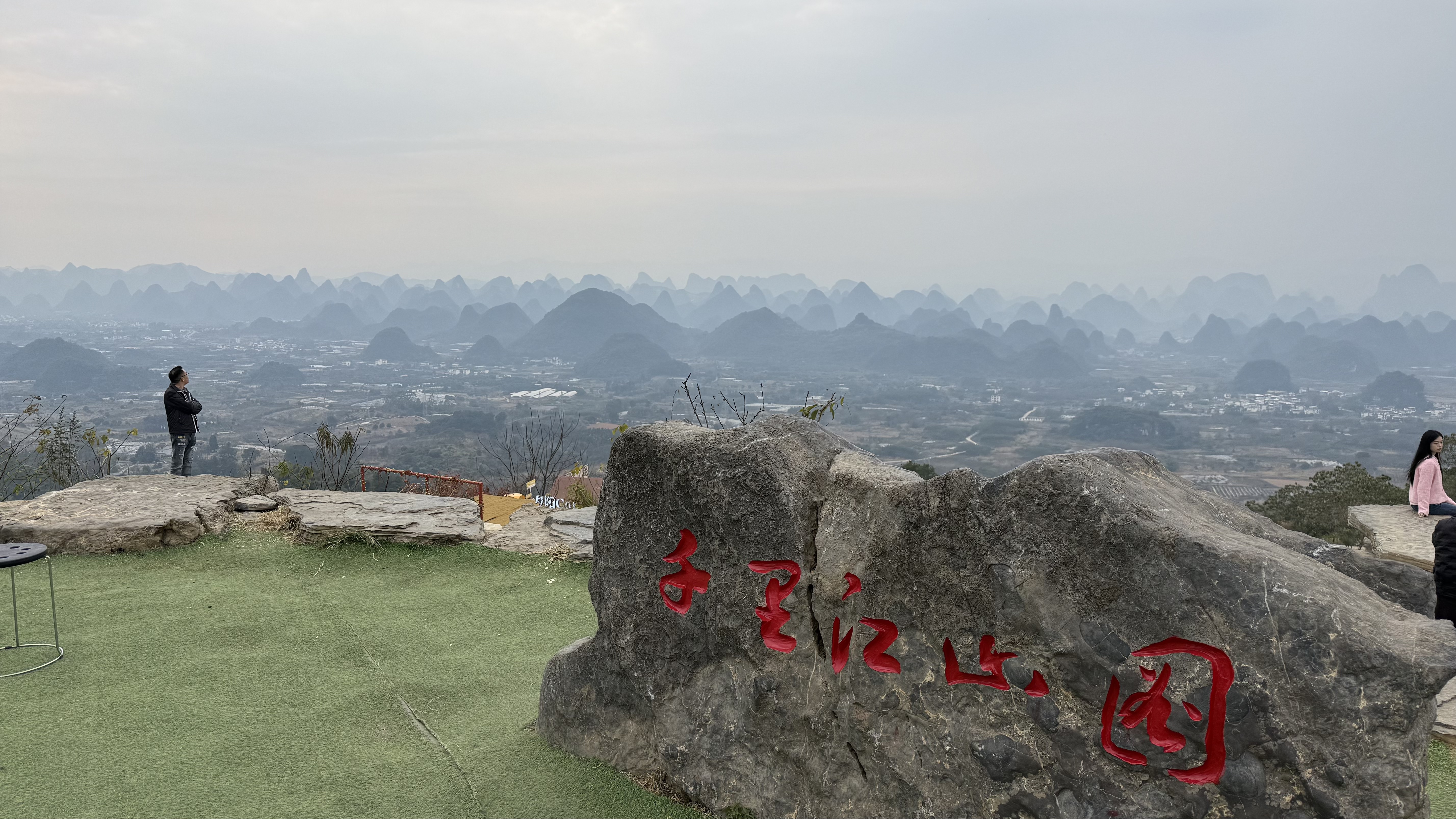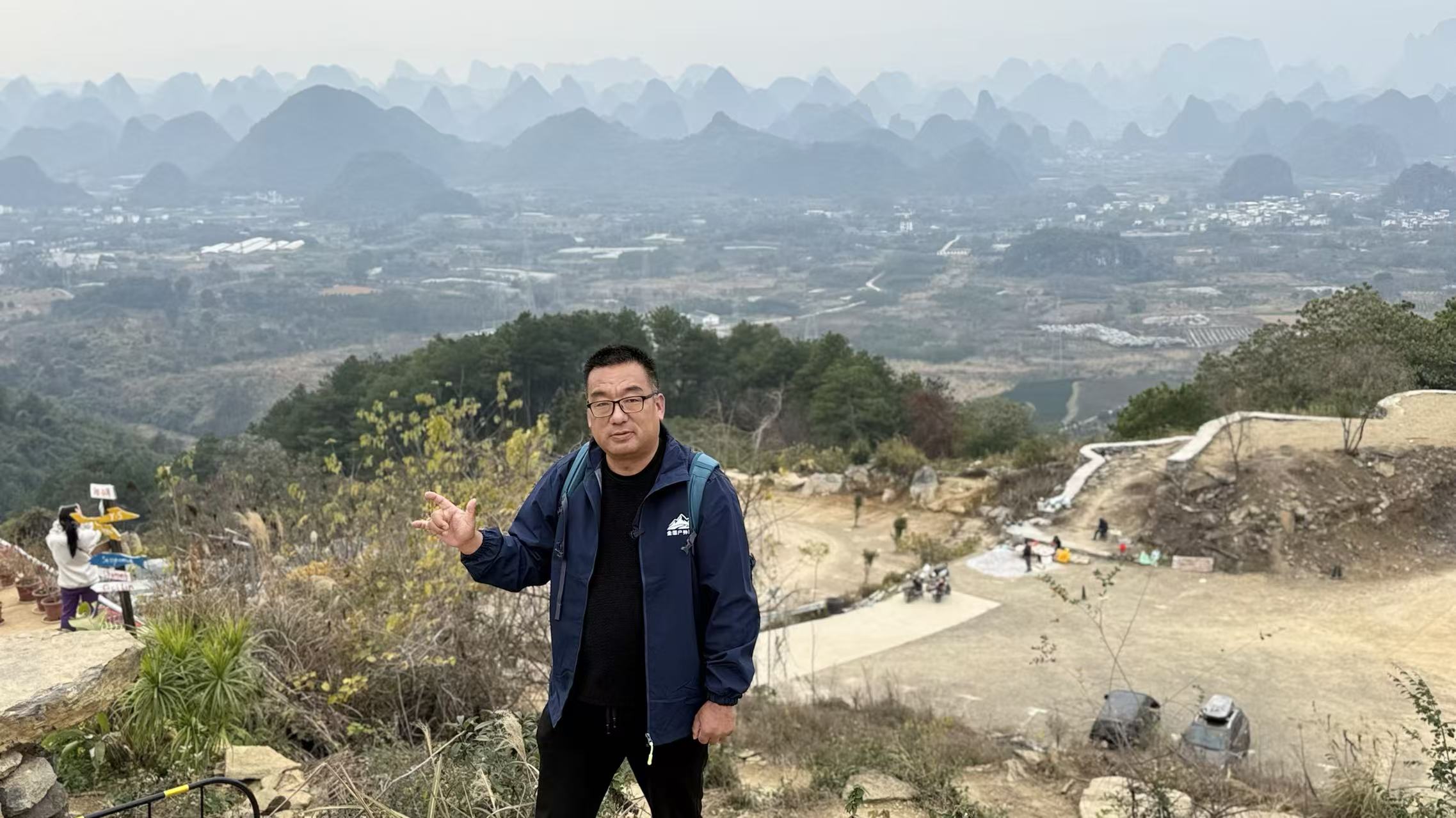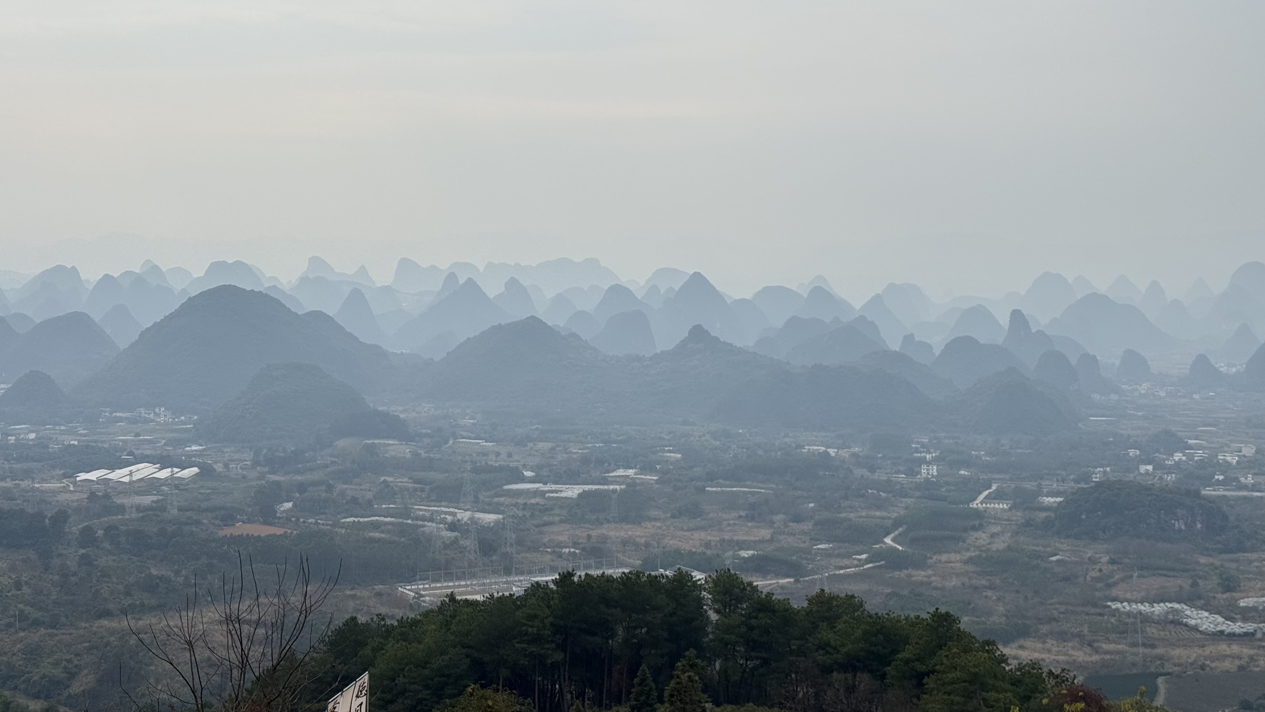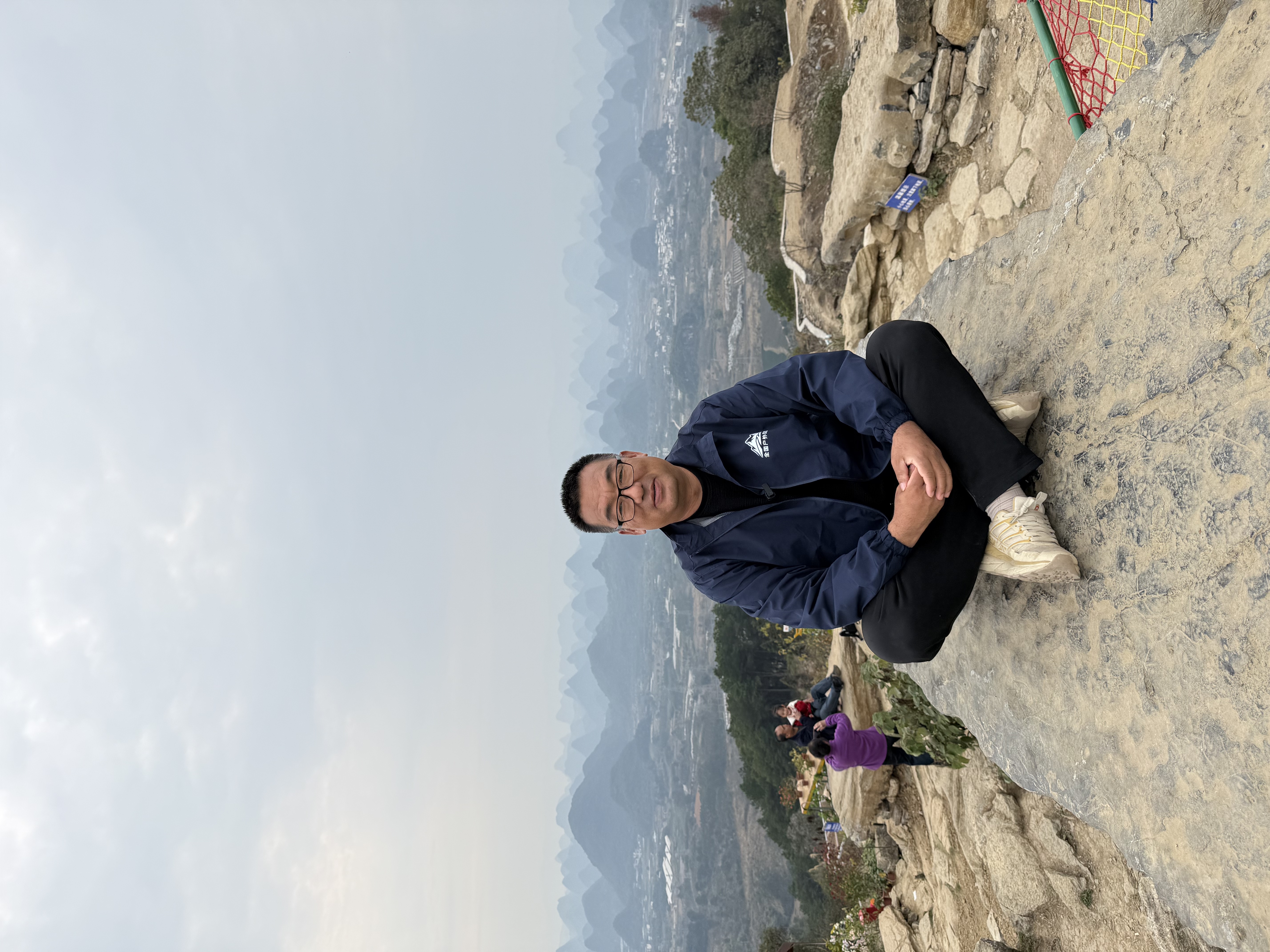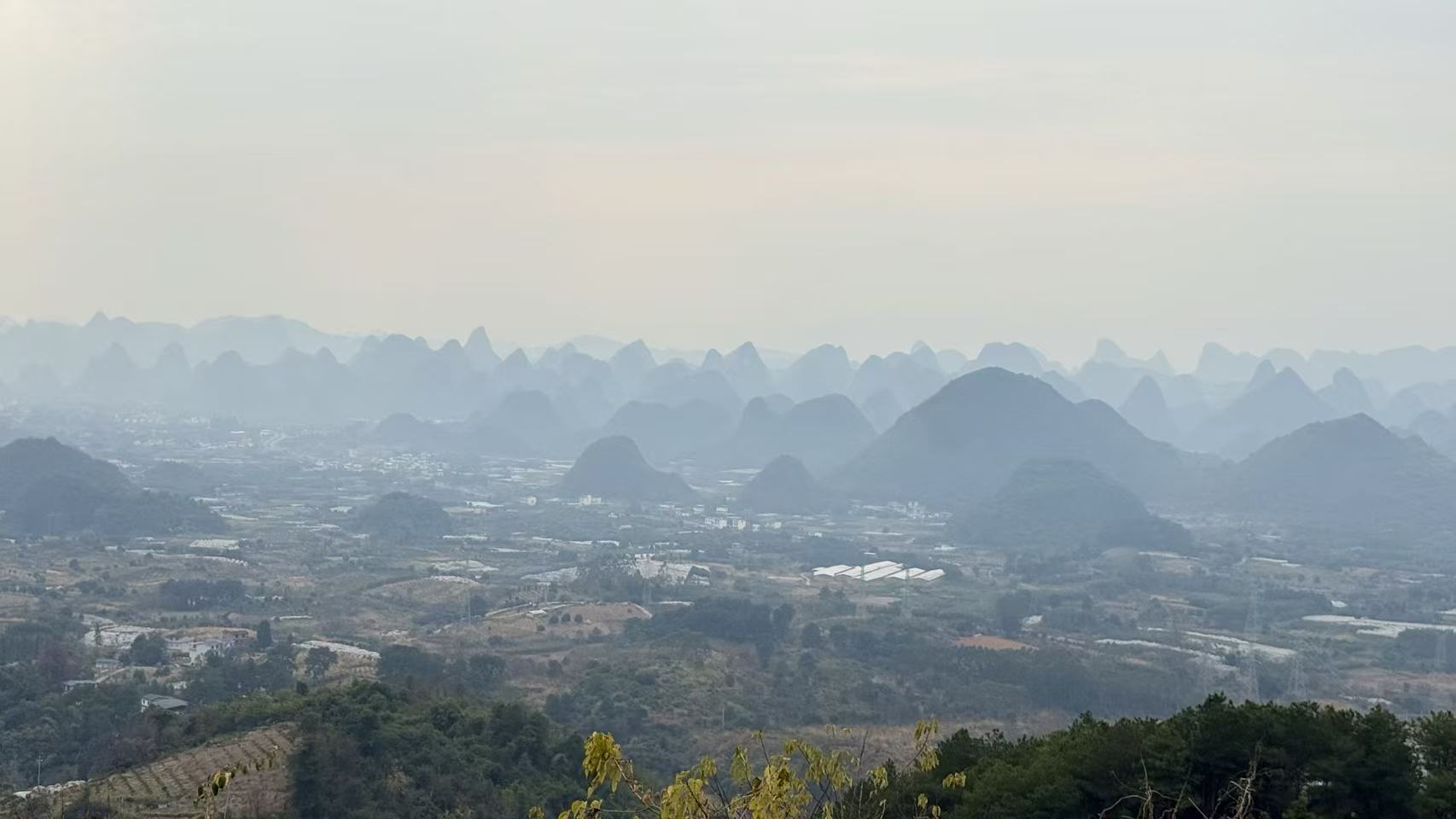 登顶平台满眼震撼:远山淡影,青烟如黛。