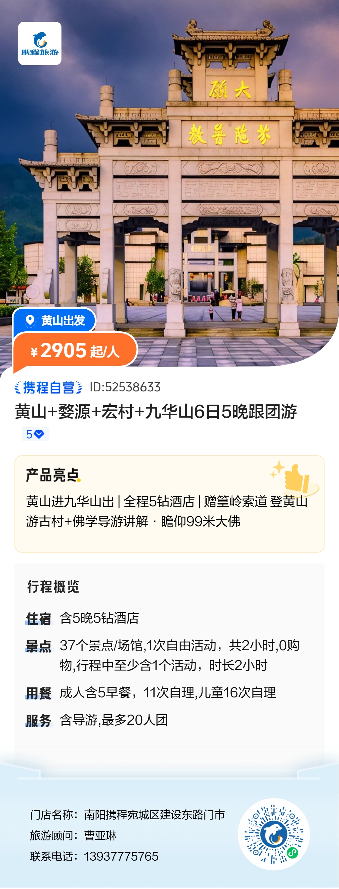 【门票】行程中所列景点/场馆首道大门票黄山门票+往返景区交通车,宏村门票,篁岭门票+篁岭上下缆车,九华山门票+往返景区交通车