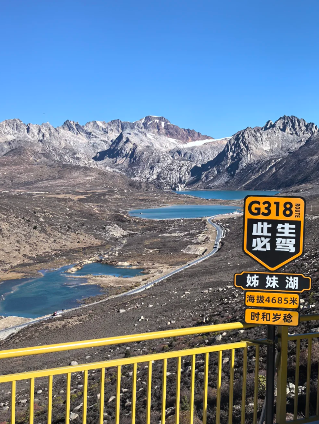 姊妹湖观景平台位于四川甘孜理塘与巴塘交界处 318 国道旁、海子山自然保护区内,海拔 4685 米,是免费观赏姊妹湖(眼镜湖)的核心点位。平台分全景观景台与湖畔近距离观景点,可清晰俯瞰一大一小两汪碧蓝湖泊依偎雪山的壮阔画面。这里是古冰川遗迹,经幡白塔点缀,光影变幻间湖如宝石。作为川藏线黄金打卡地,无需门票,也是拍摄雪山映湖、日照金山的绝佳机位,需注意高原反应与强风保暖。