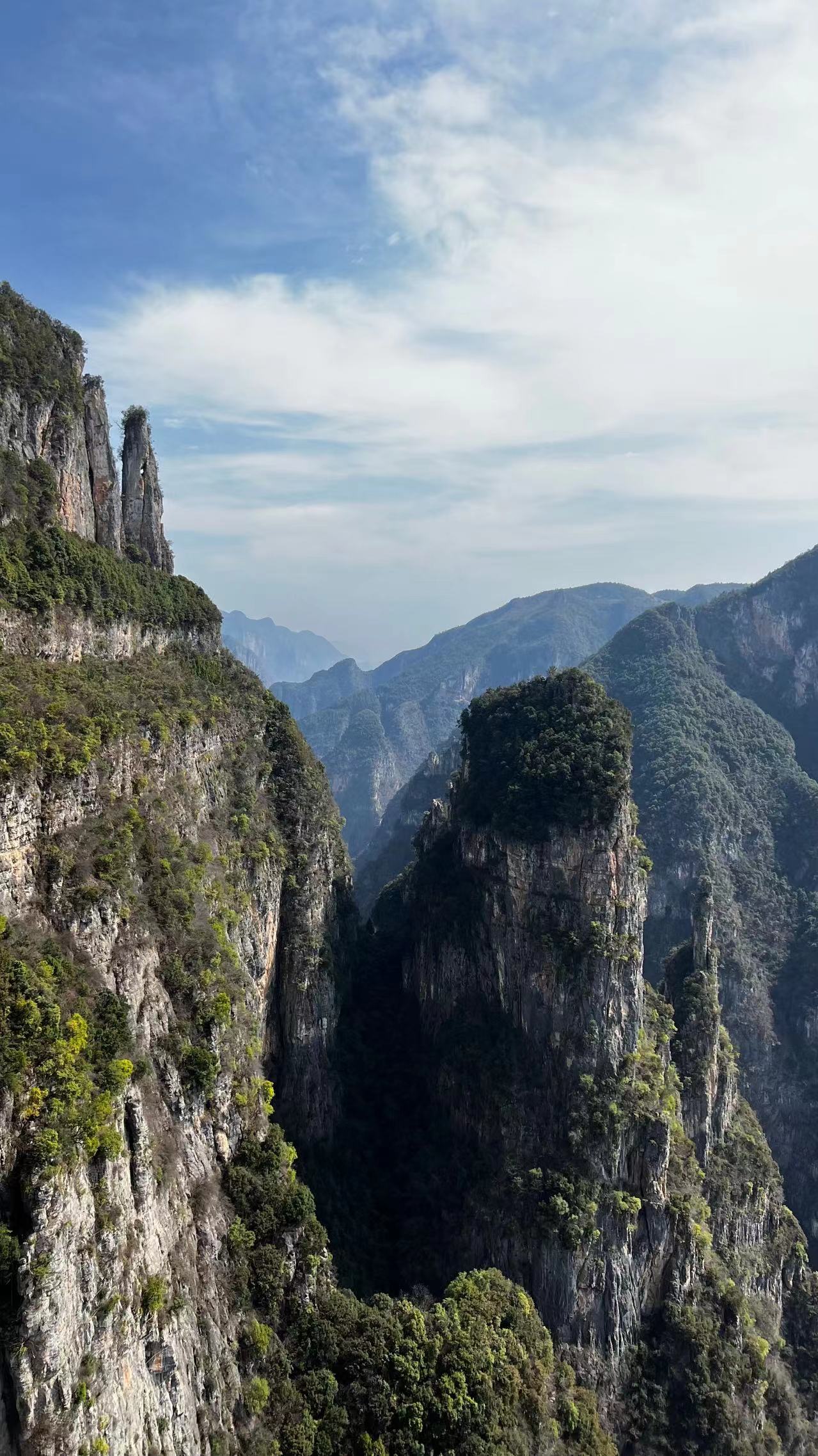 【神女天路】公路盘旋于悬崖峭壁之间,车辆时常穿行于雾霭之中,如同在天上行走,因而命名神女天路