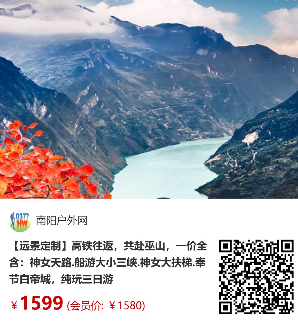 返程: 巫山-南阳东G3422次(12:42-15:17抵达)或G2680次(14:04-16:17抵达)或G1710次(15:11-17:11抵达)或G3406次(15:53-18:13抵达)此为参考车次春运期间以实际出票为准,抵达南阳,结束愉快行程!