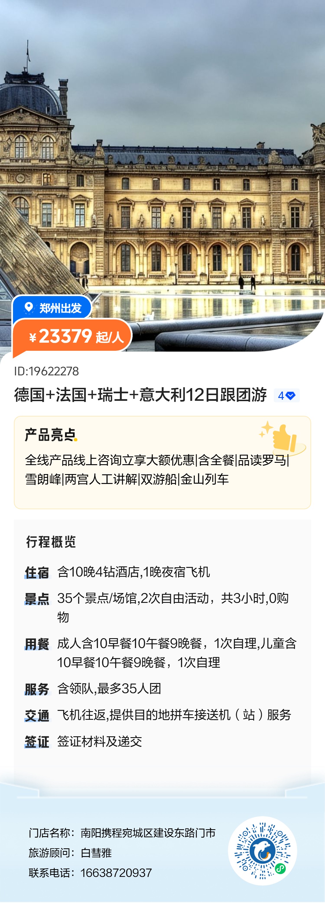 【门票】行程中所列景点/场馆首道大门票卢浮宫(含人工讲解)、凡尔赛宫(含人工讲解)、塞纳河游船;金色山口景观列车(二等座)、雪朗峰;贡多拉游船、罗马深度游含专业讲解、五渔村;详细参照附带行程中所列之景点(其他为免费对外开放或外观景点或另付费项目);